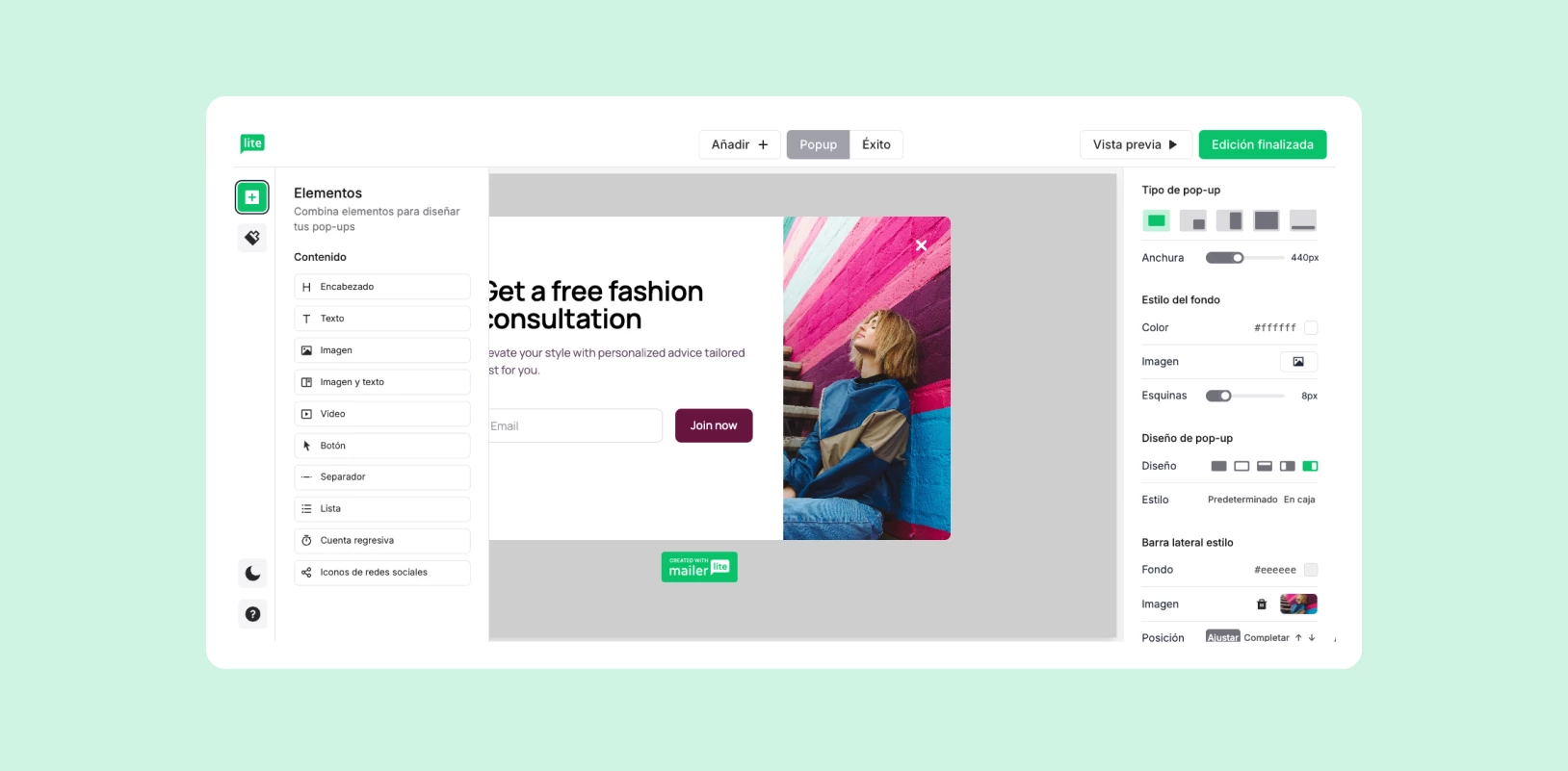 Da rienda suelta a tu creatividad con herramientas de diseño flexibles que dan vida a tus ideas. Comienza eligiendo el estilo de tus pop-ups de entre las distintas opciones disponibles, como lightbox, barra flotante, deslizante, pantalla completa o media pantalla. A continuación, ajusta el ancho, el fondo, la opacidad, el radio de las esquinas y el diseño desde nuestra nueva barra lateral de ajustes, siempre accesible.