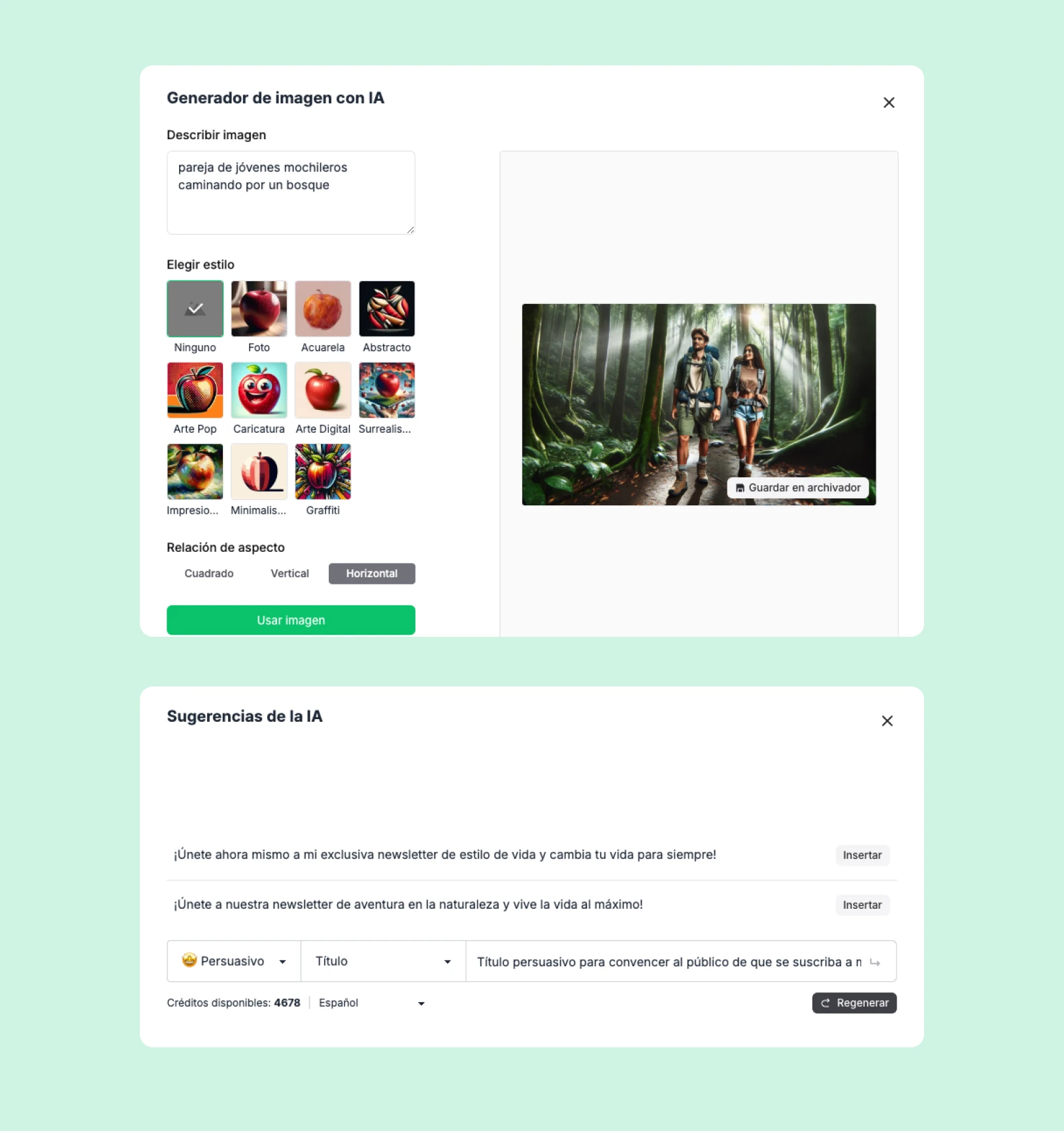 ¿Te cuesta encontrar las palabras adecuadas? Crea ideas mágicas para títulos, llamados a la acción, descripciones y mucho más en un instante. O genera elementos visuales llamativos para que tus ventanas emergentes destaquen y animen a los visitantes a actuar.