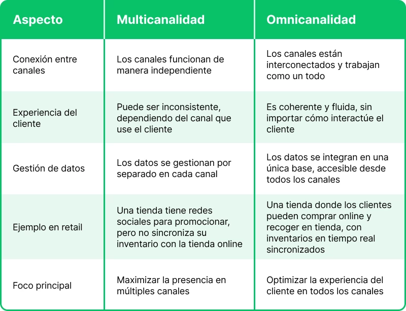 Mientras que la multicanalidad implica la presencia de una empresa en diferentes canales, tanto físicos como digitales, para interactuar con los clientes, la omnicanalidad va un paso más allá, ya que esta última no solo utiliza múltiples canales, sino que los integra para ofrecer una experiencia unificada.