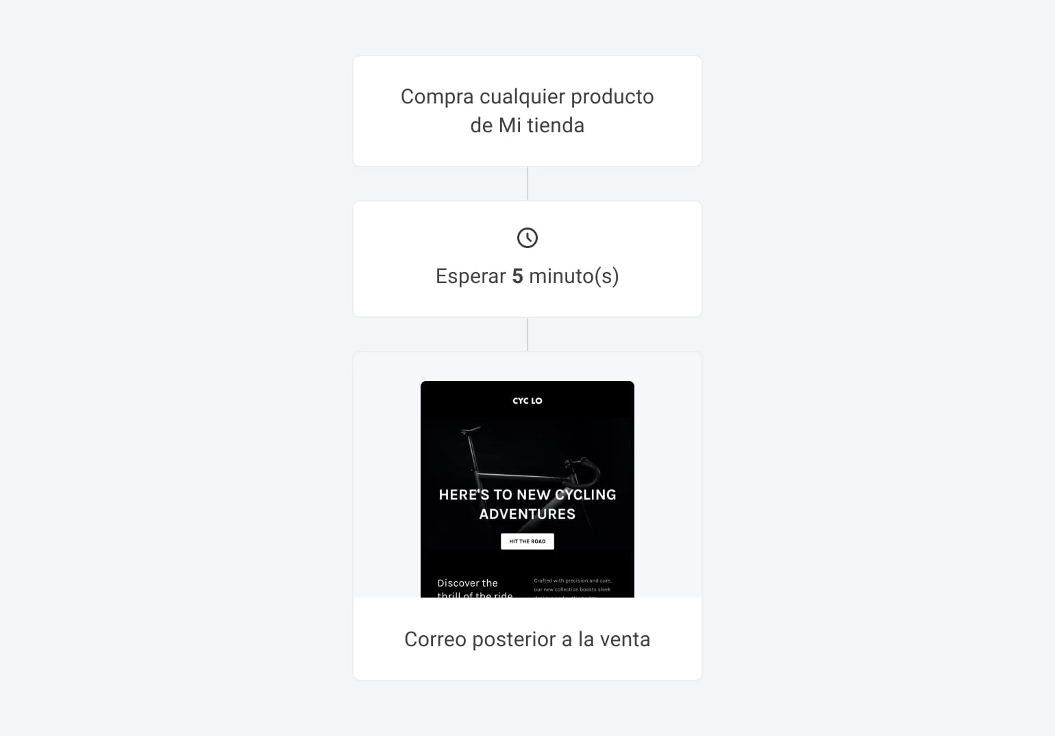 Mientras tanto, el activador Compras de cualquier producto puede utilizarse para realizar un seguimiento con mensajes generales postventa de los que se beneficiarán todos los compradores, como solicitudes de revisión, correos electrónicos de recomendación o encuestas a clientes.