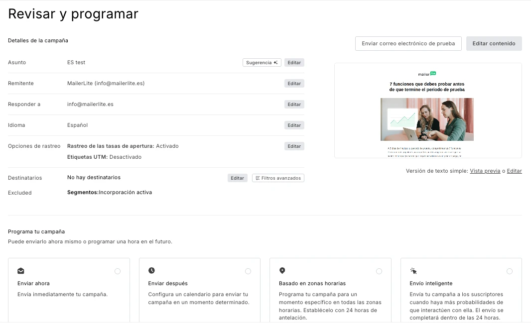 MailerLite: Dispone de optimización de la hora de envío que te permite realizar envíos en función de las zonas horarias, o cuando es más probable que los suscriptores interactúen con tus correos.