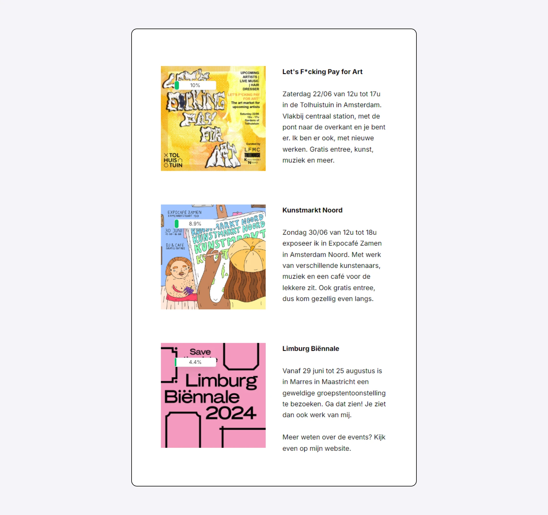 Siempre compruebo en qué obras hace más clic la gente en mis newsletters. Esto me ayuda a ver qué obras son más populares, y utilizo esa información para promocionarlas más en las redes sociales o en otras comunicaciones. Es una forma útil de saber qué resuena entre mi público basándome en datos claros, como clics y aperturas, en lugar de basarme en conjeturas.