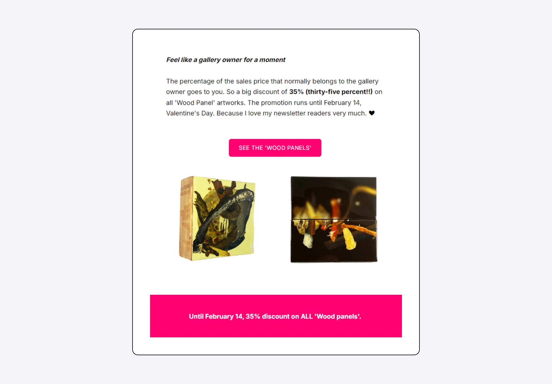 Sus correos se centran en anuncios de exposiciones, nuevas obras disponibles y contenido exclusivo para suscriptores.