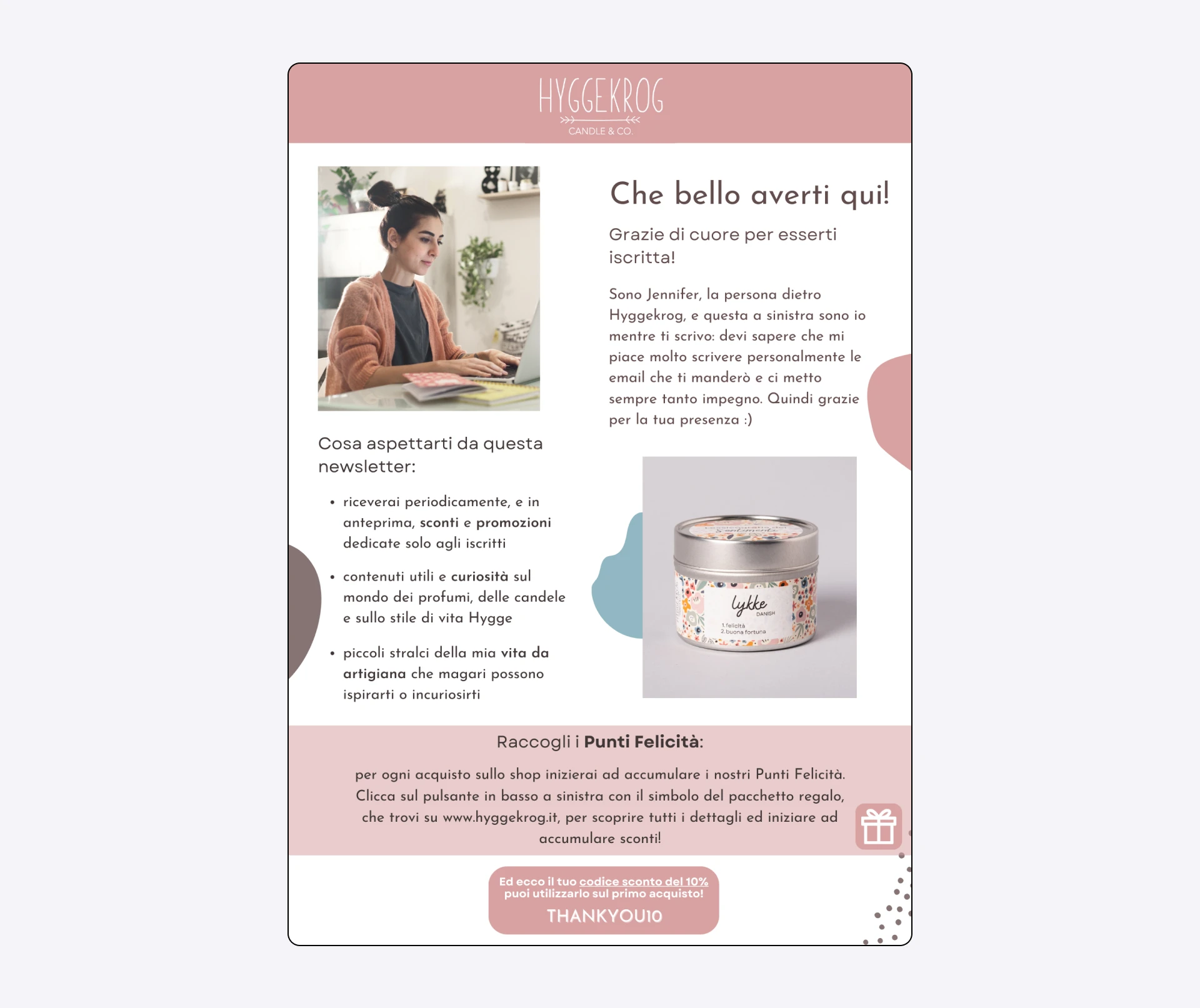 Los compradores reciben un correo electrónico de bienvenida en cuanto se suscriben, que utilizo para presentarme, contarles un poco lo que hago y dejarles un código de descuento para que lo utilices en su primera compra.