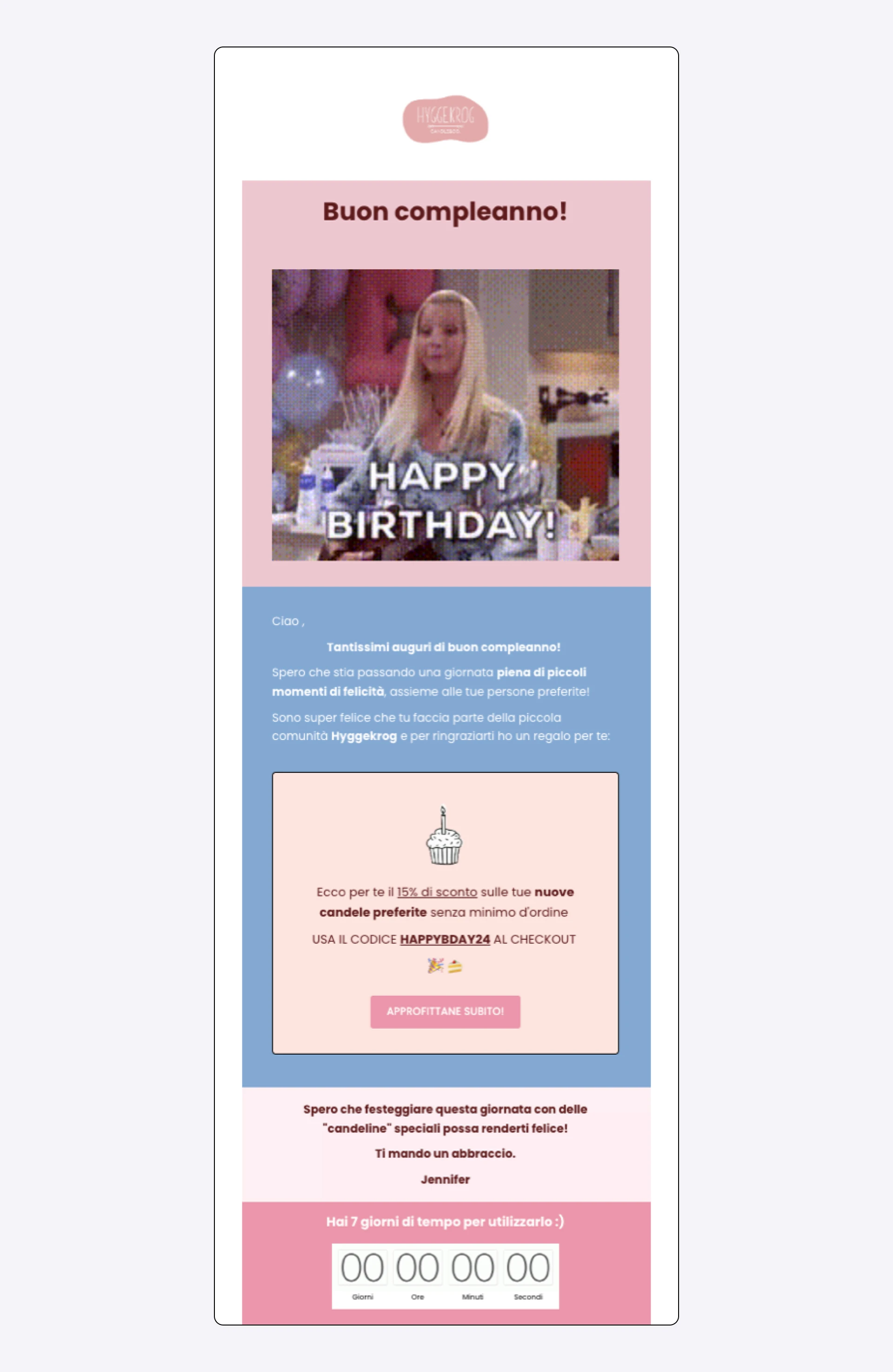 Jennifer utiliza los correos electrónicos de cumpleaños para crear un toque personal con sus clientes. Les envía un código de descuento personalizado el día de su cumpleaños, haciéndoles sentir especiales.