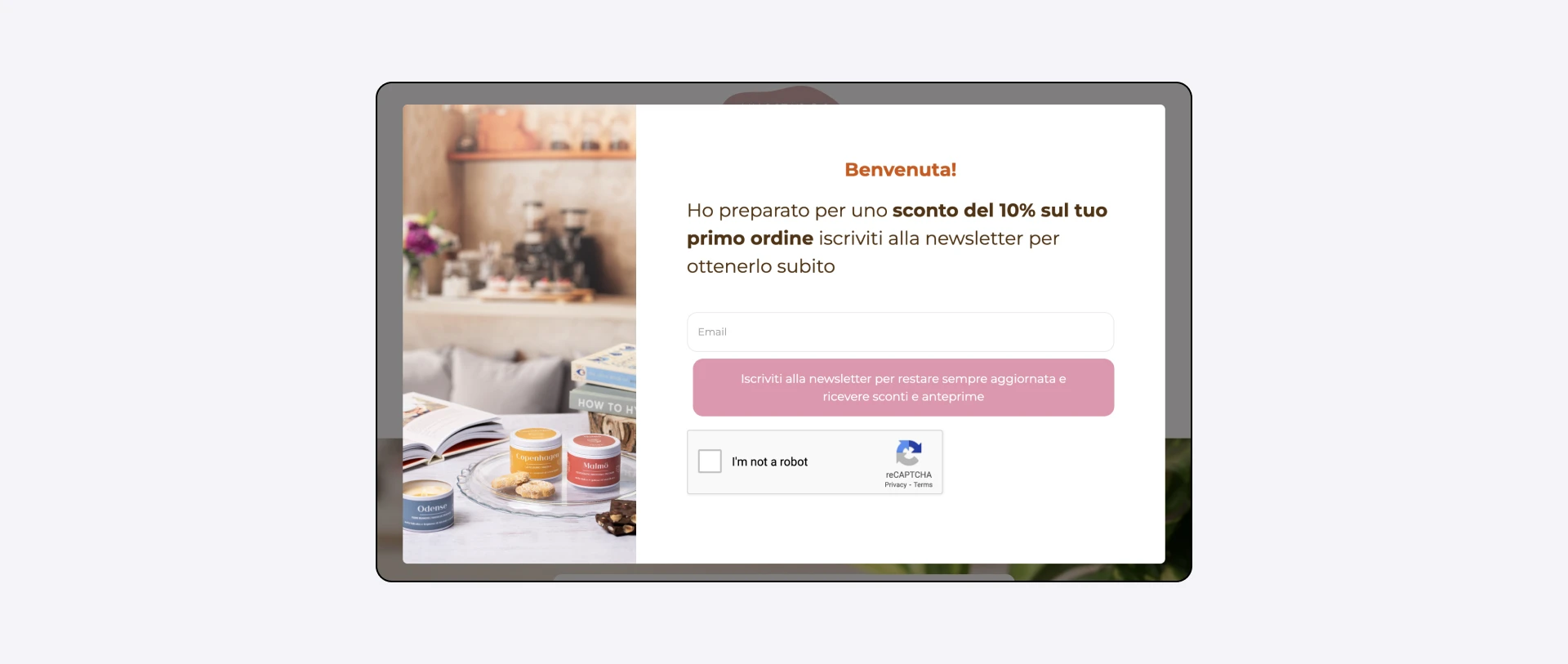 Una vez que la gente conoce su marca, visita el sitio web. A partir de ahí, Jennifer utiliza un pop-up para animar a la gente a unirse a su lista ofreciendo un 10% de descuento a quien se suscriba.