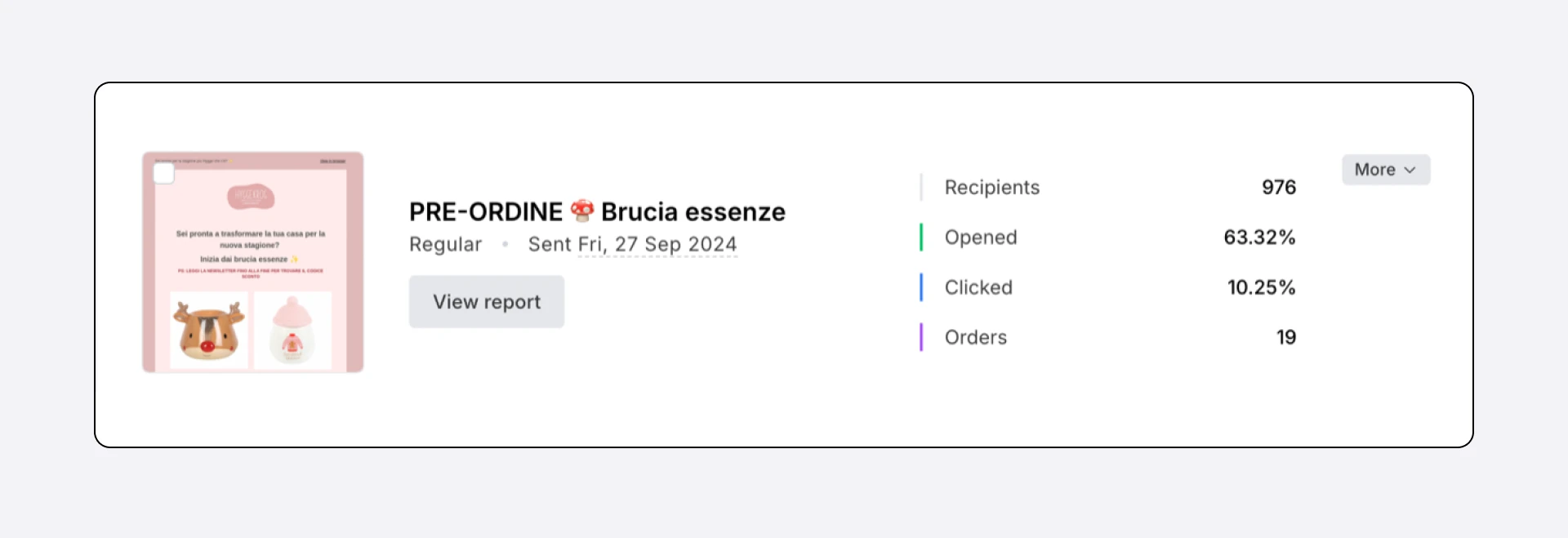 Un reciente correo electrónico que incluía un pedido anticipado de velas navideñas tuvo una tasa de apertura del 63% y una tasa de clics del 10%, lo que significa que más de 600 personas vieron su oferta. ¡Y no tuvo que gastar ni un céntimo en anuncios!