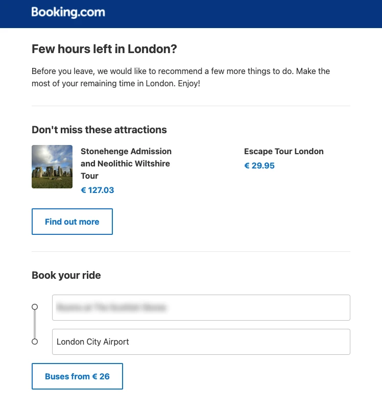 Por ejemplo, Booking.com envía este mensaje personalizado a un suscriptor que acaba de finalizar su estancia en un hotel de Londres. ¡Incluso hay información sobre cómo reservar un viaje desde su hotel al aeropuerto!