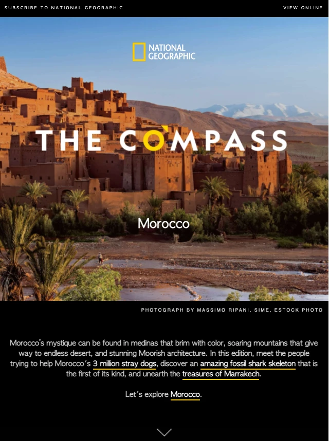 En este newsletter de viajes, National Geographic enseña a sus lectores sobre Marruecos.