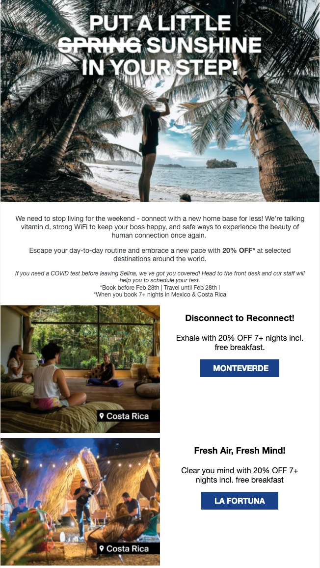 Este newsletter de viajes está destinado a hacer sonreír a la gente con la divertida cabecera y tentadores vistazos de diferentes lugares de viaje: “Pon un poco de sol primaveral en tus pasos”.
