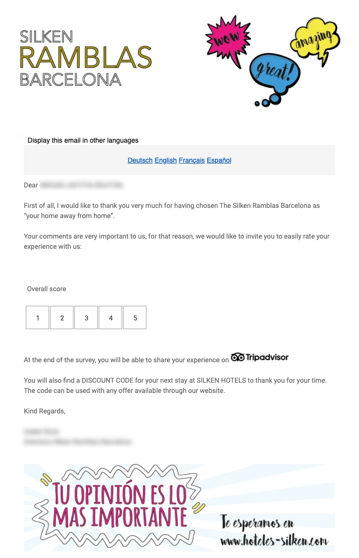 En este correo electrónico personalizado, un hotel en Barcelona hace posible que dejar reseñas sea súper fácil. Las encuestas NPS por correo electrónico funcionan bien para averiguar cuán satisfechos están tus clientes.