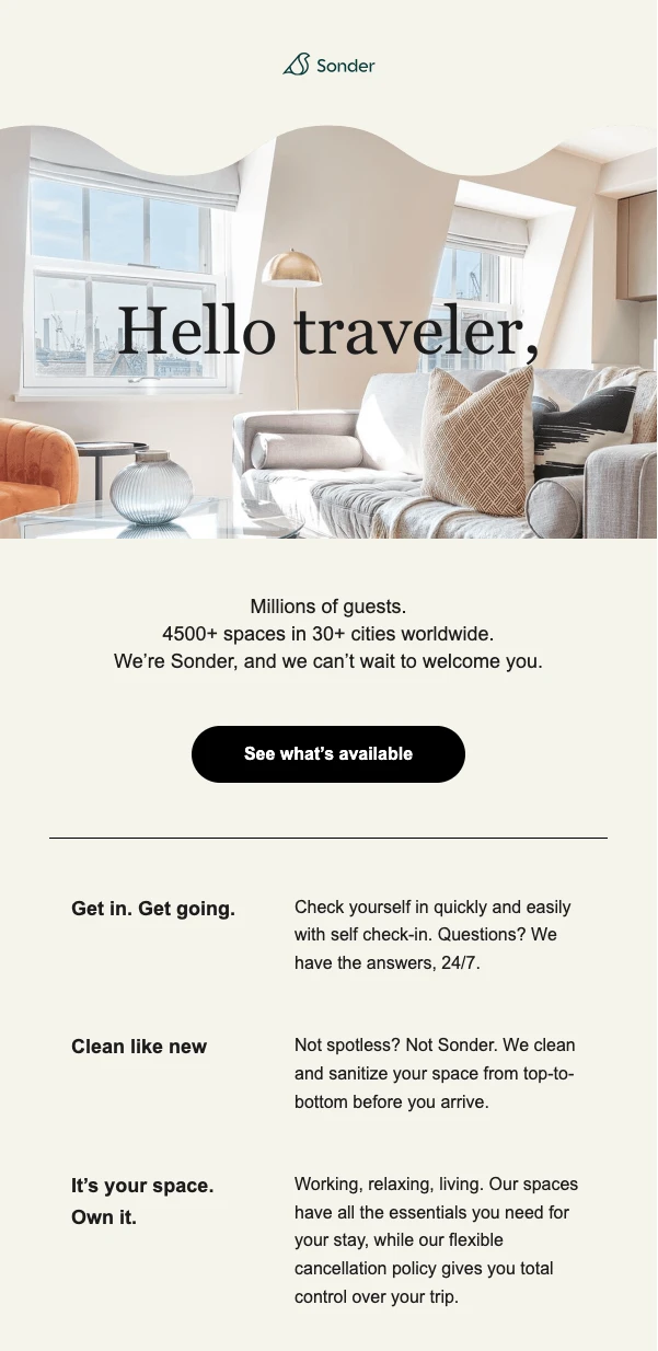Así es como Sonder recibe a sus nuevos suscriptores, con una impresionante foto de un apartamento para llamar la atención, además de un llamado a la acción (CTA) destacado: “Qué hay disponible”.