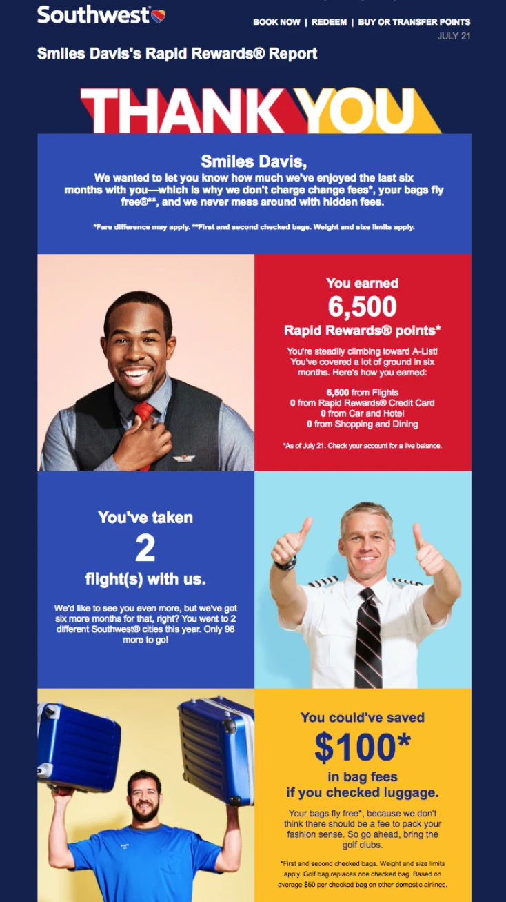 Este correo de Southwest Airlines hace exactamente eso. La personalización es de primer nivel, desde el nombre del cliente hasta su historial de viajes y los puntos del programa de lealtad obtenidos. Las caras sonrientes de los diversos empleados reflejan la imagen de Southwest como una de las aerolíneas más amigables del cielo.