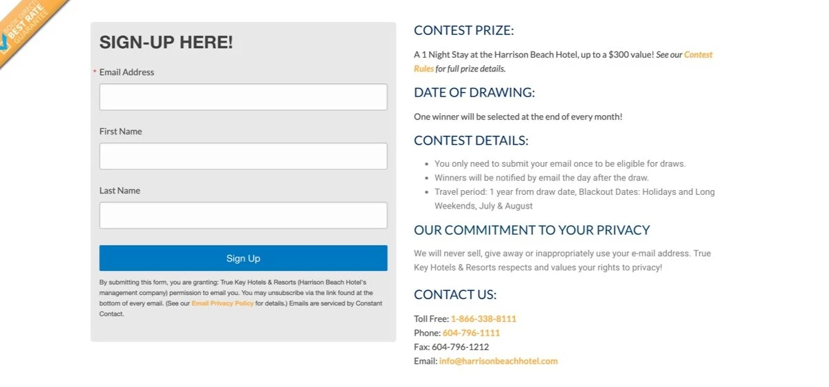 Esta página de Harrison Beach Hotel muestra cómo los visitantes del sitio web tienen la oportunidad de ganar una estancia gratis de 1 noche (hasta un valor de $300) simplemente inscribiéndose.