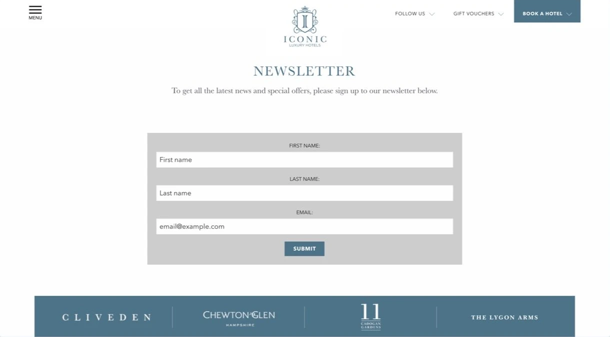 A menudo encontrarás formularios integrados en el pie de página del sitio web y la barra lateral del blog. Este es el formulario de registro que utiliza Iconic Luxury Hotel para que las personas se suscriban a su boletín de noticias de agencias de viajes.