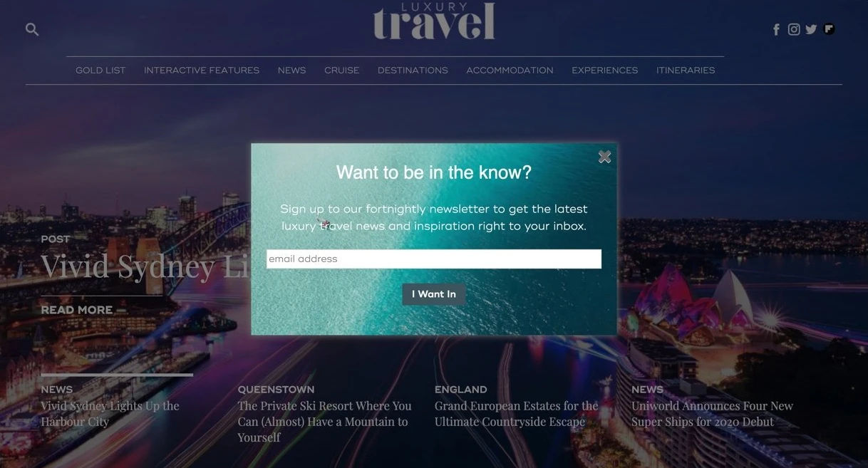 Así es como Luxury Travel Magazine usa pop-ups. Proporcionan una razón clara para inscribirse en su newsletter de viajes y solo piden una dirección de correo electrónico. El mar de fondo suma una onda de vacaciones.