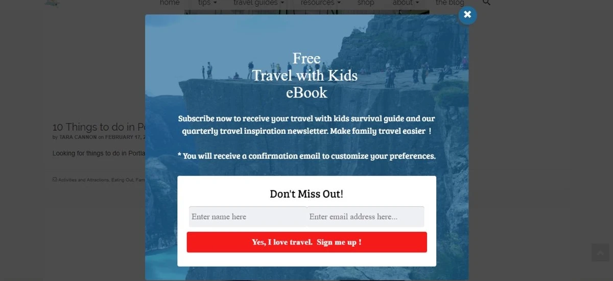 La bloguera de viajes Tara Cannon de Pint Size Pilot también utiliza lead magnets como una forma inteligente de recoger nuevos suscriptores.