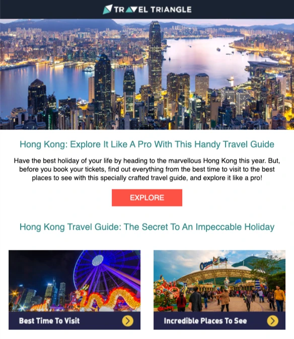 Esta guía de Hong Kong por Travel Triangle ofrece una impresionante selección de ideas de viaje, con fotos llamativas para ayudar a los lectores a imaginarse allí mismo. Con encabezados claros y CTA audaces, puedes captar la atención de tus suscriptores y hacer que respondan de la manera que quieras.