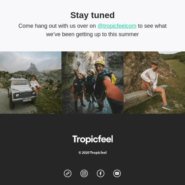 Difunde tu exposición y anima a las personas a que se relacionen contigo. Puedes añadir publicaciones en las redes sociales directamente a tu campaña de correo electrónico de viajes o agregar botones de redes sociales, así como Tropicfeel lo hace a continuación incluyendo los 4 íconos redondos de las plataformas sociales más populares.