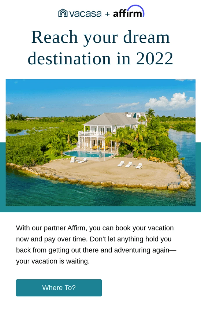 Por ejemplo, Vacasa le dice a sus suscriptores que ‘alcancen el destino de sus sueños en 2022’, y luego deja que esta impresionante foto de una casa en paraíso tropical haga el resto.