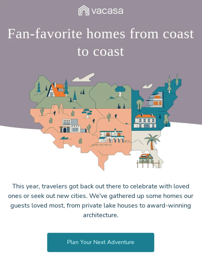 ¿Podemos tomarnos un minuto para apreciar las hermosas ilustraciones en este correo electrónico de viaje? Celebra a los viajeros que pudieron ‘volver a viajar’ en 2021. Los colores complementarios llaman la atención instantáneamente y hacen que el lector quiera desplazarse hacia abajo para ver las casas preferidas que la gente visitó.