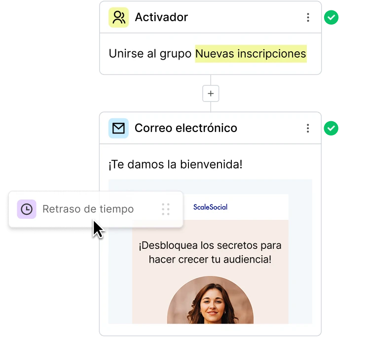 Crea flujos de trabajo que den la bienvenida a tus suscriptores, entreguen productos y realicen el seguimiento de tus clientes potenciales de forma automática. Empieza con una plantilla de automatización o crea la tuya propia.