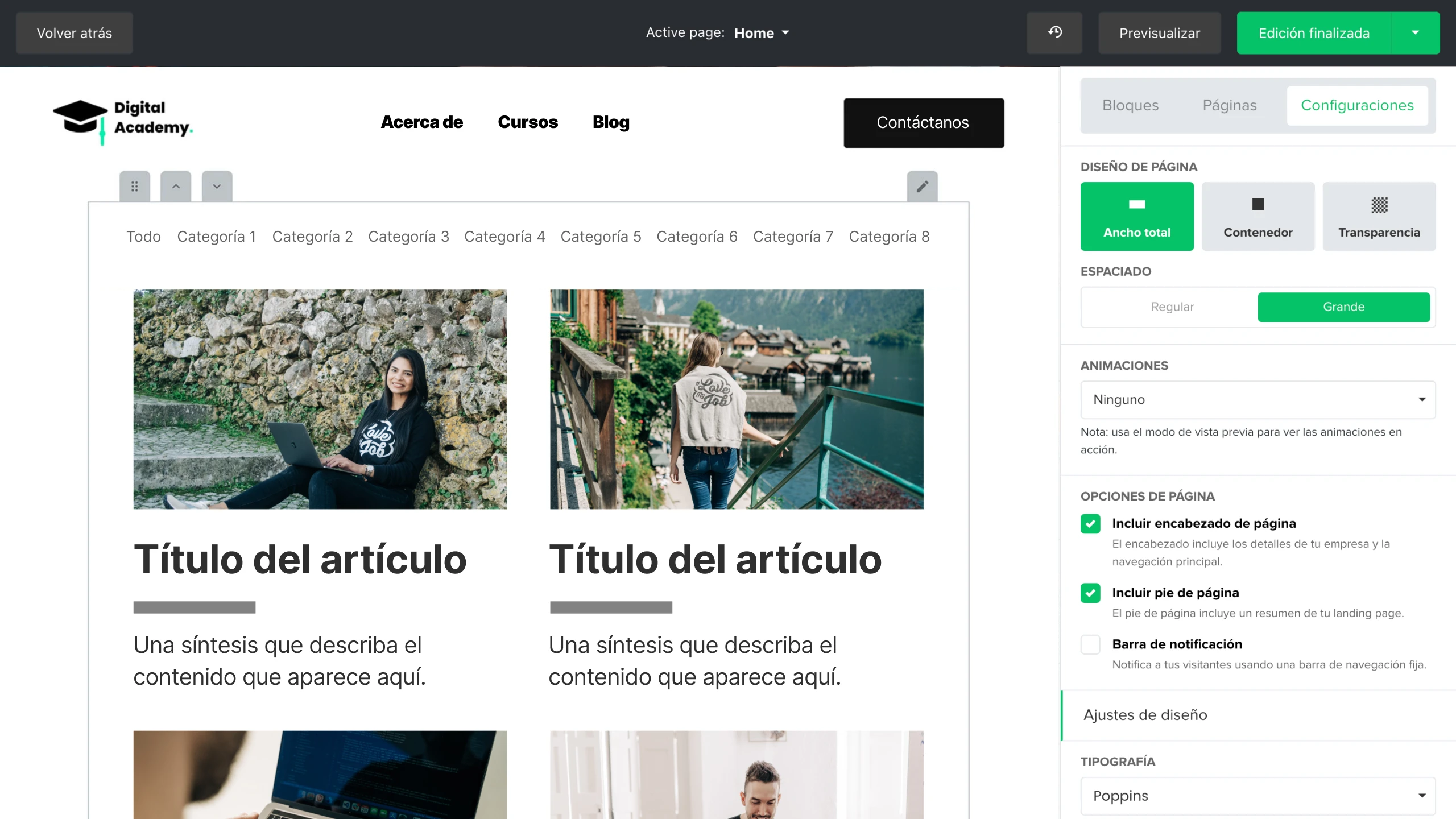 Arrastra y suelta bloques de contenido para diseñar una página de inicio y una página de descripción general del blog.