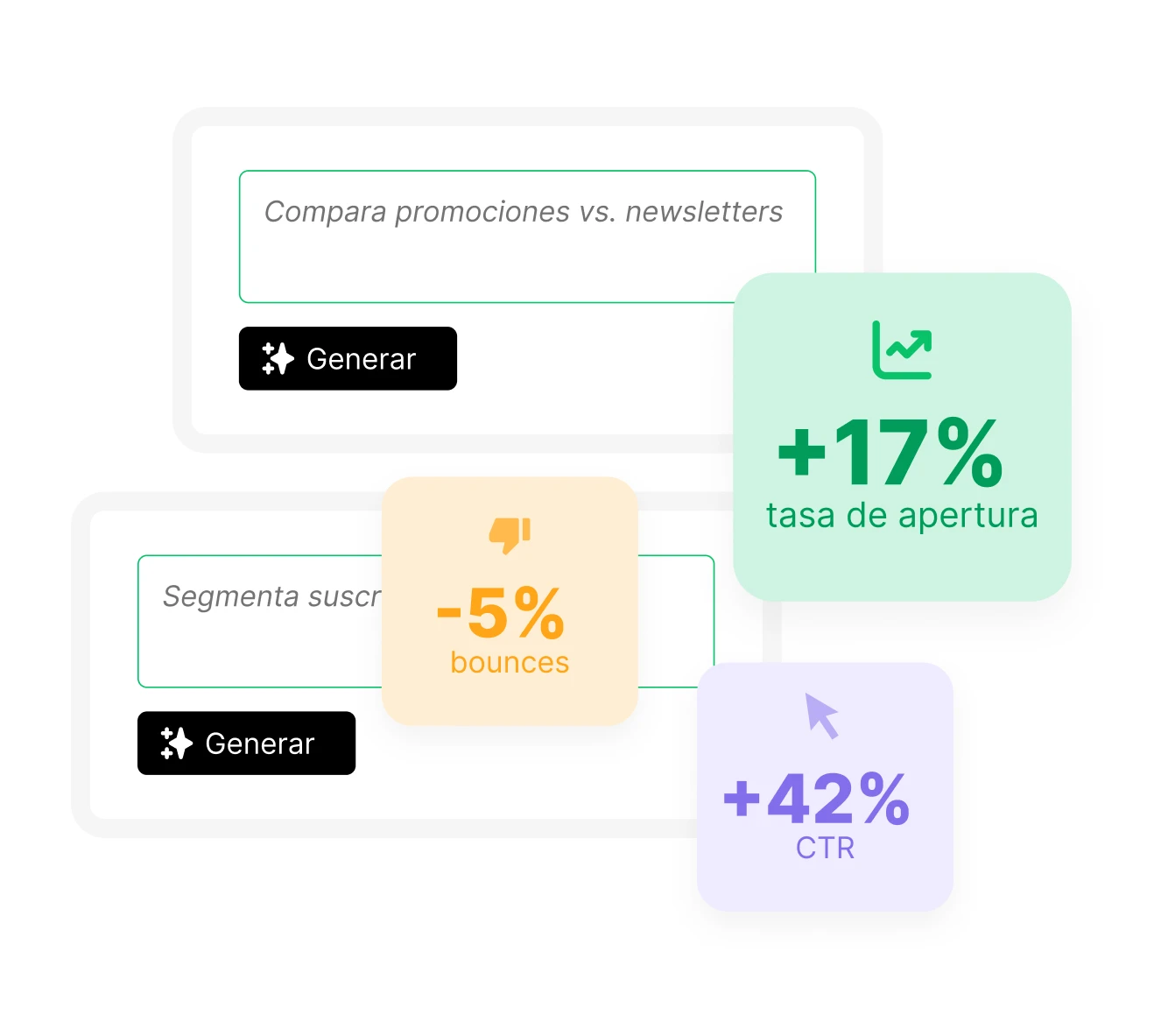 Tu asistente de IA te ofrece información clave sobre tu lista y planes de acción como, por ejemplo: “2,500 suscriptores no han abierto ningún email en 9 meses. Por esta razón, he preparado un borrador para una campaña de reactivación. ¿Quieres que cree la automatización?”