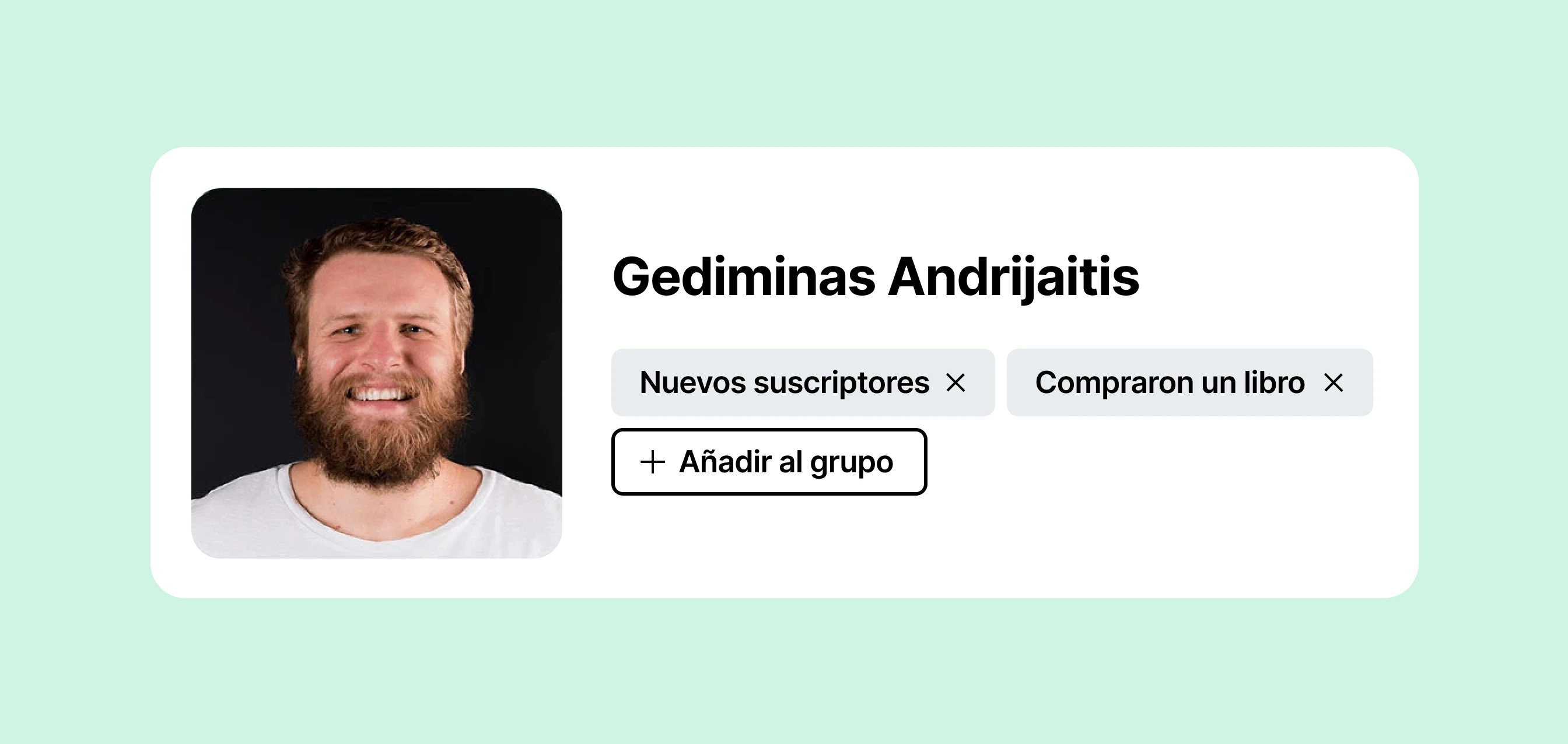 Crea grupos de interés de suscriptores (etiquetas) basados en sus comportamientos o intereses (por ejemplo, viajero, amante del café, tecnólogo, etc.). Puedes mover manualmente a los suscriptores a grupos o establecer una automatización basada en los pasos de acción.