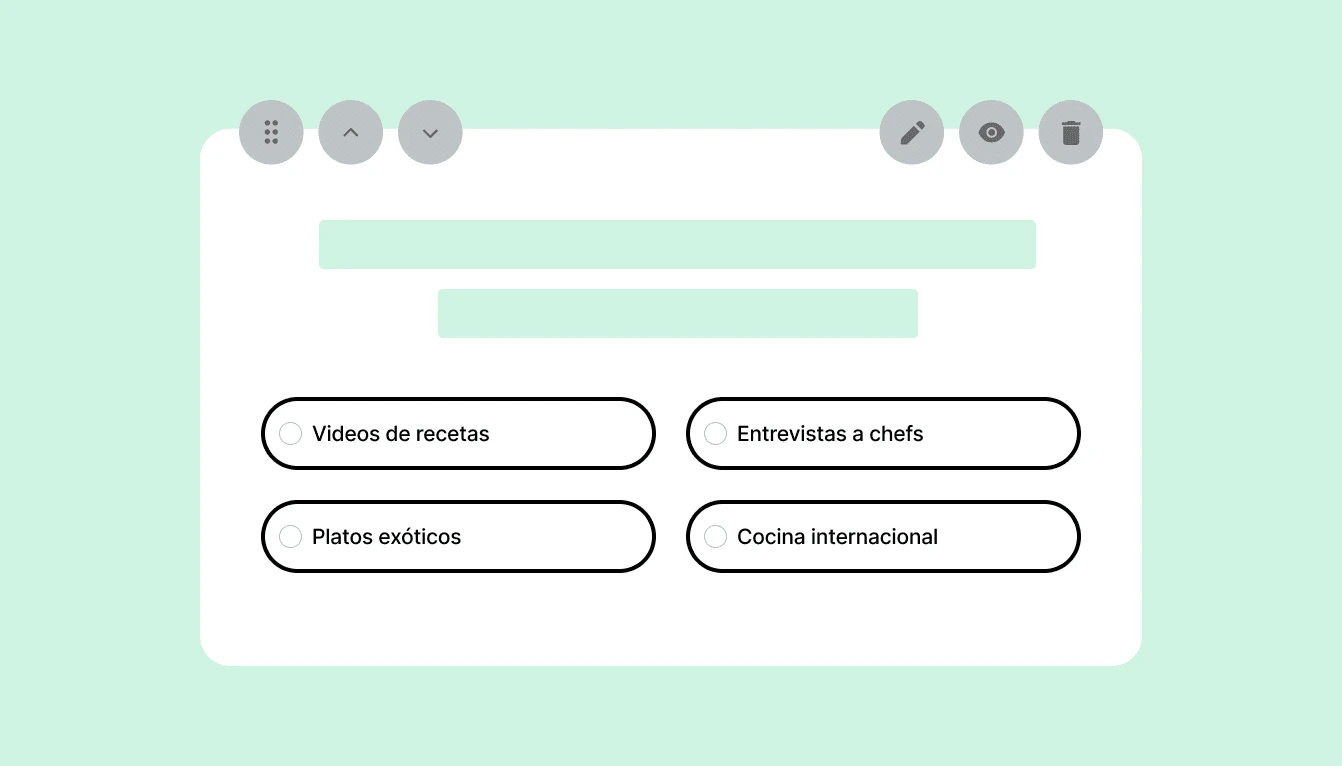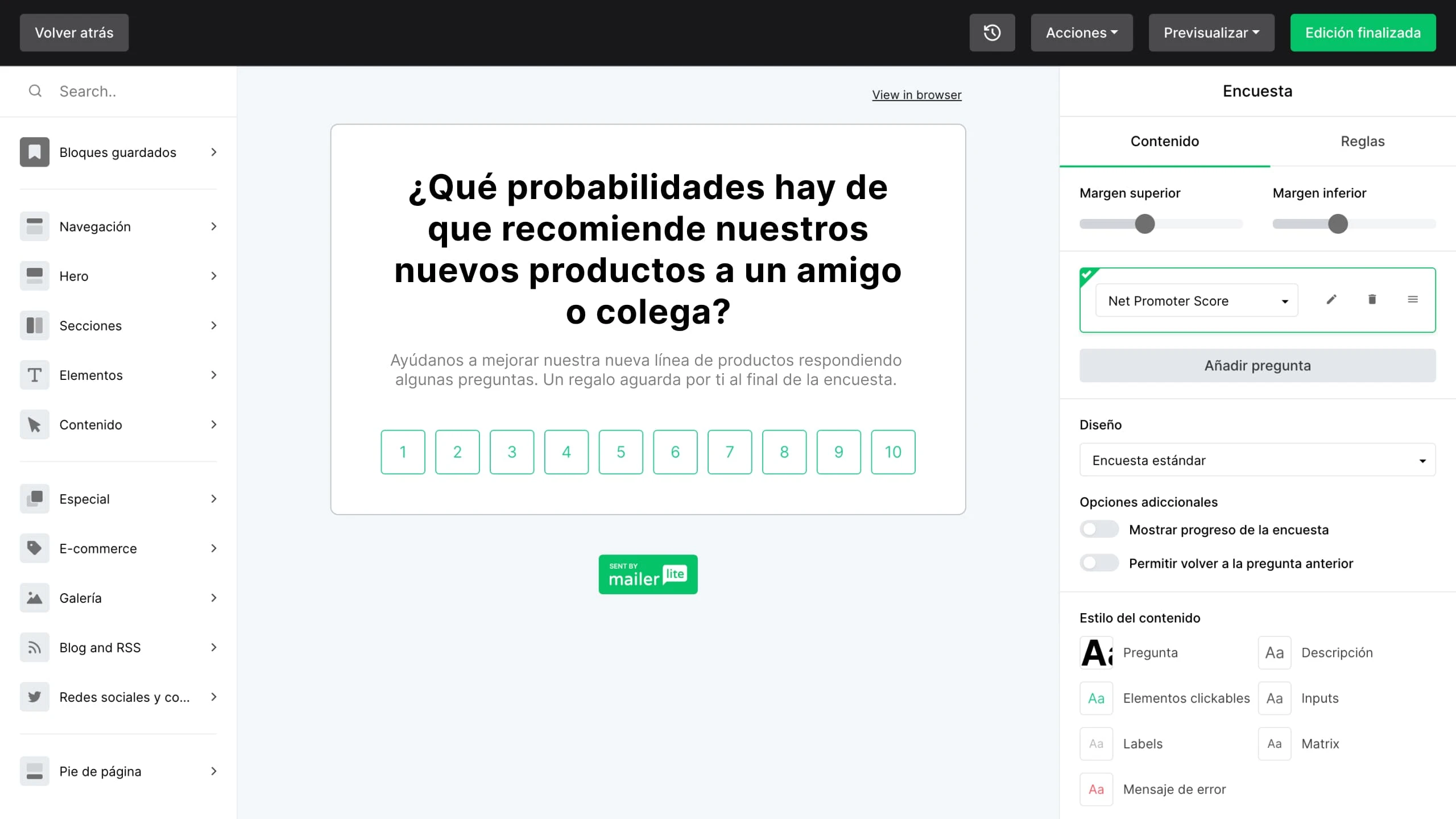 Despídete de las herramientas de encuestas por correo electrónico de terceros. El editor de arrastrar y soltar facilita la creación de encuestas personalizadas con bloques predefinidos, ajustes de diseño y plantillas.