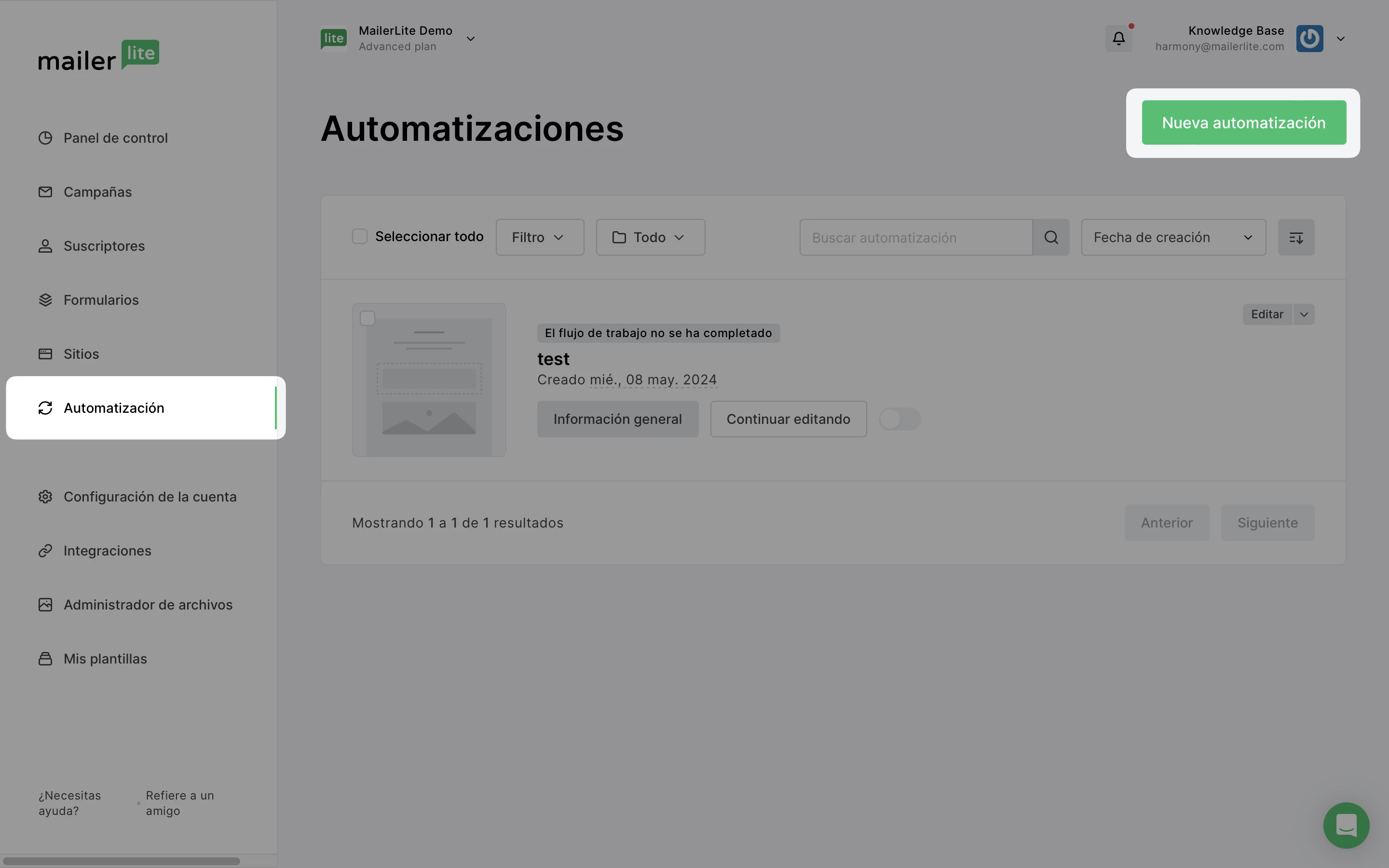 Haz clic en Nueva automatización para empezar a construir tu secuencia.