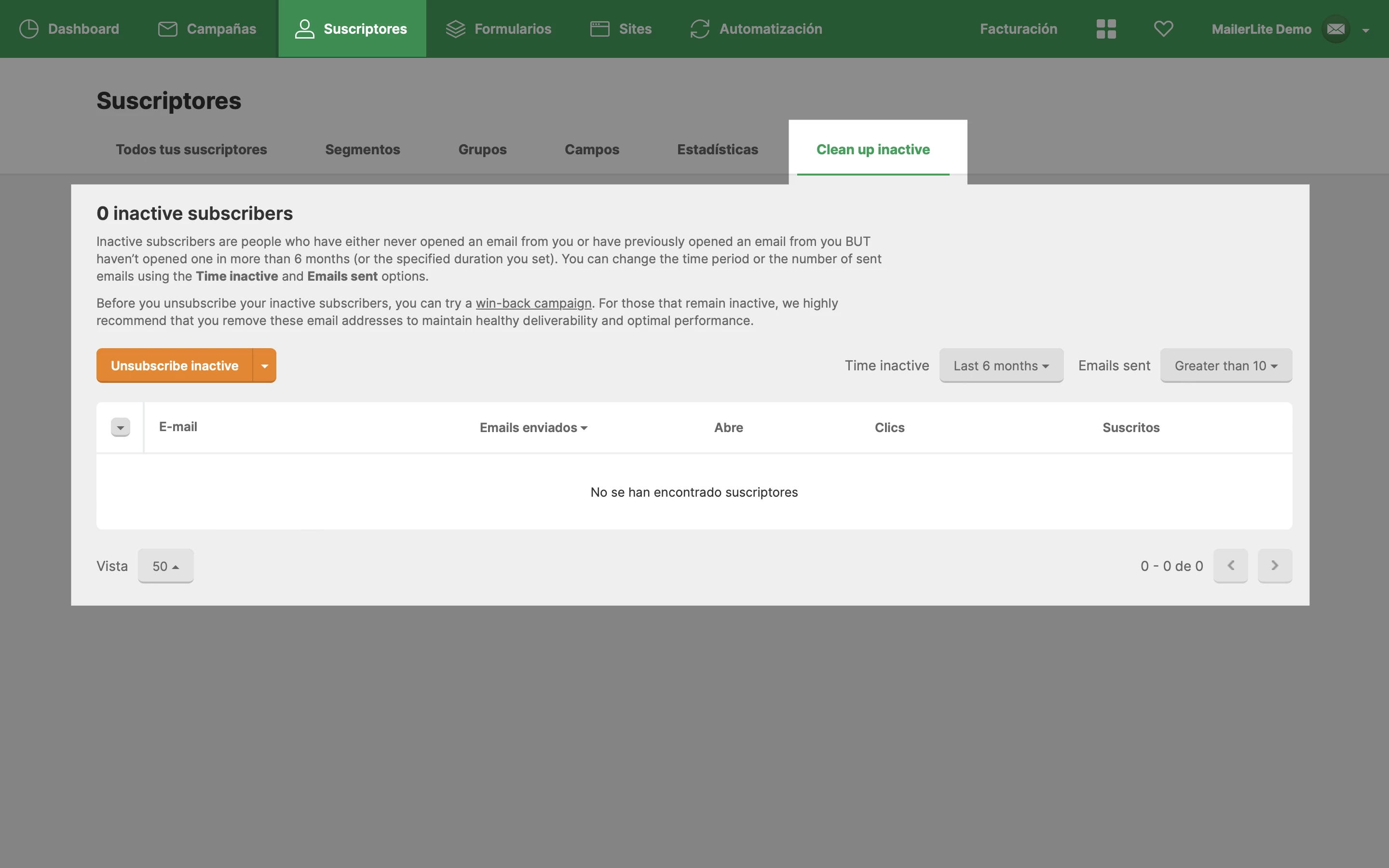 Utilizando los archivadores, puedes comprobar qué suscriptores han estado inactivos en tu cuenta y elegir entre darlos de baja o enviarles una campaña de reenganche.