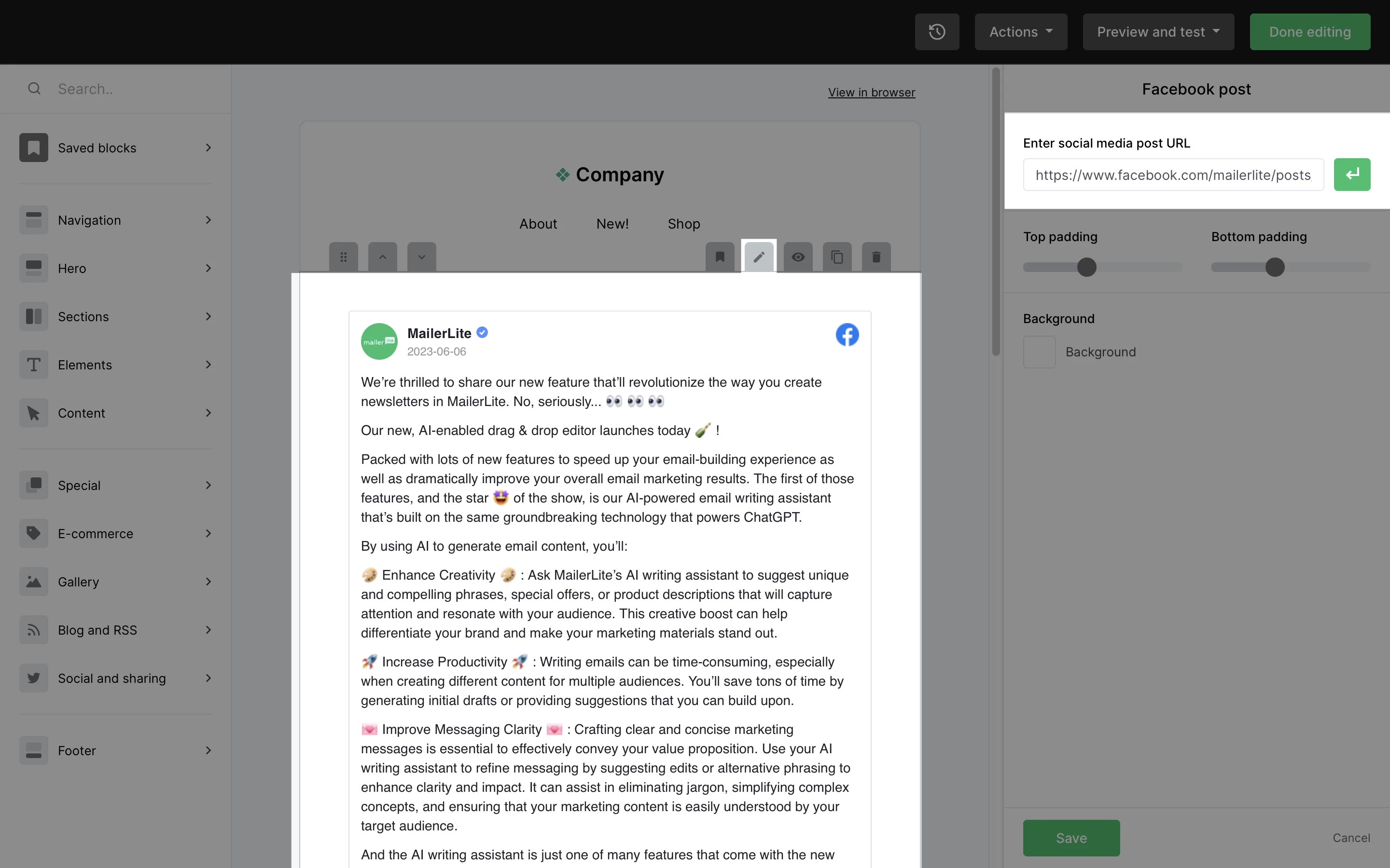 En la pestaña Redes sociales y compartir, arrastra y suelta la publicación o el bloque de Facebook en tu newsletter.