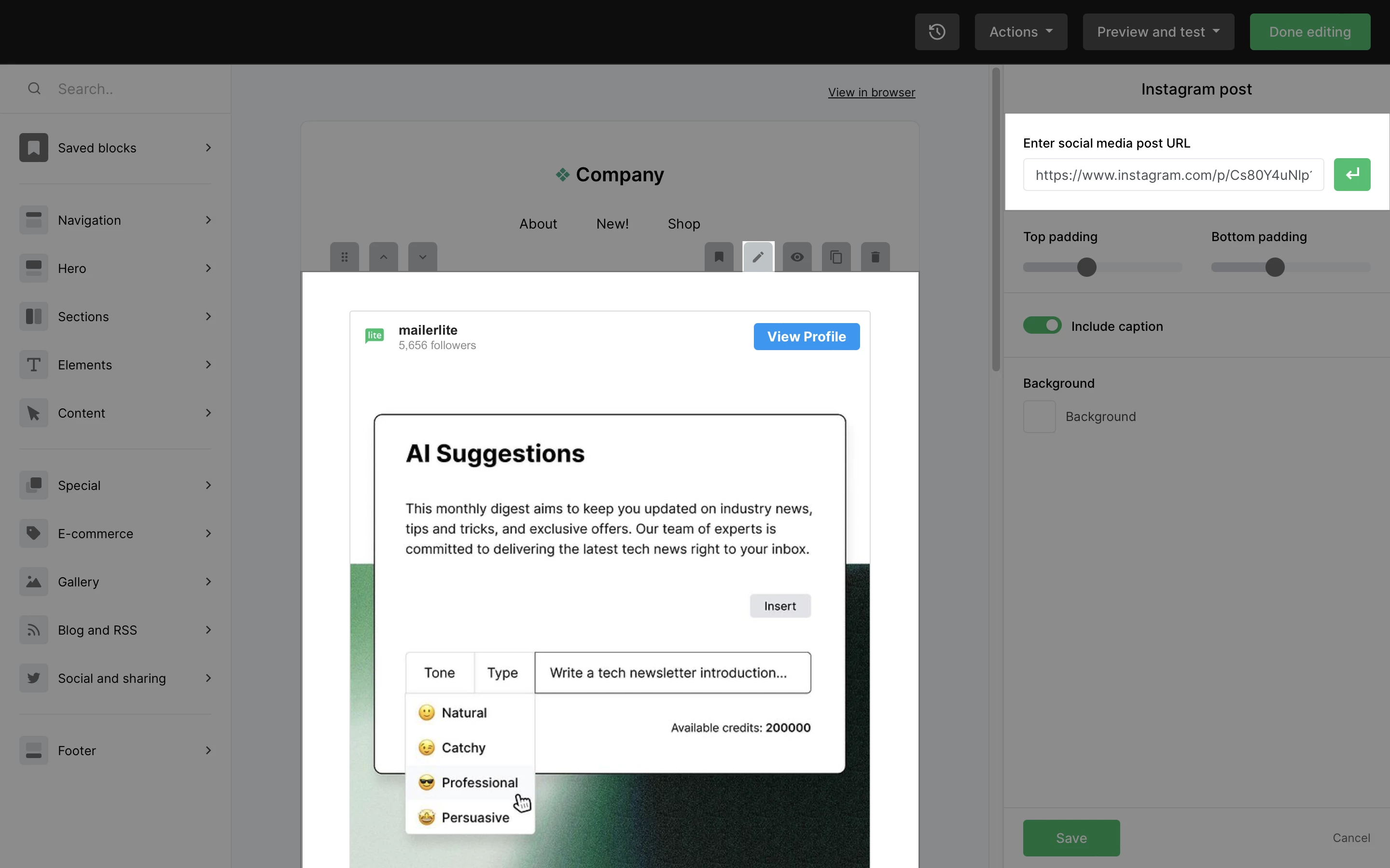 En la pestaña Redes sociales y compartir, arrastra y suelta la publicación o el bloque de Instagram en tu newsletter.