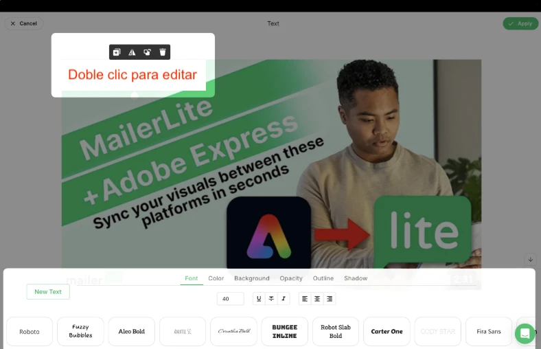 Texto - Añade texto con fuentes, tamaños, colores, fondos, bordes, sombras y más, todos personalizables. También puedes subir fuentes propias para que coincidan con tu marca.