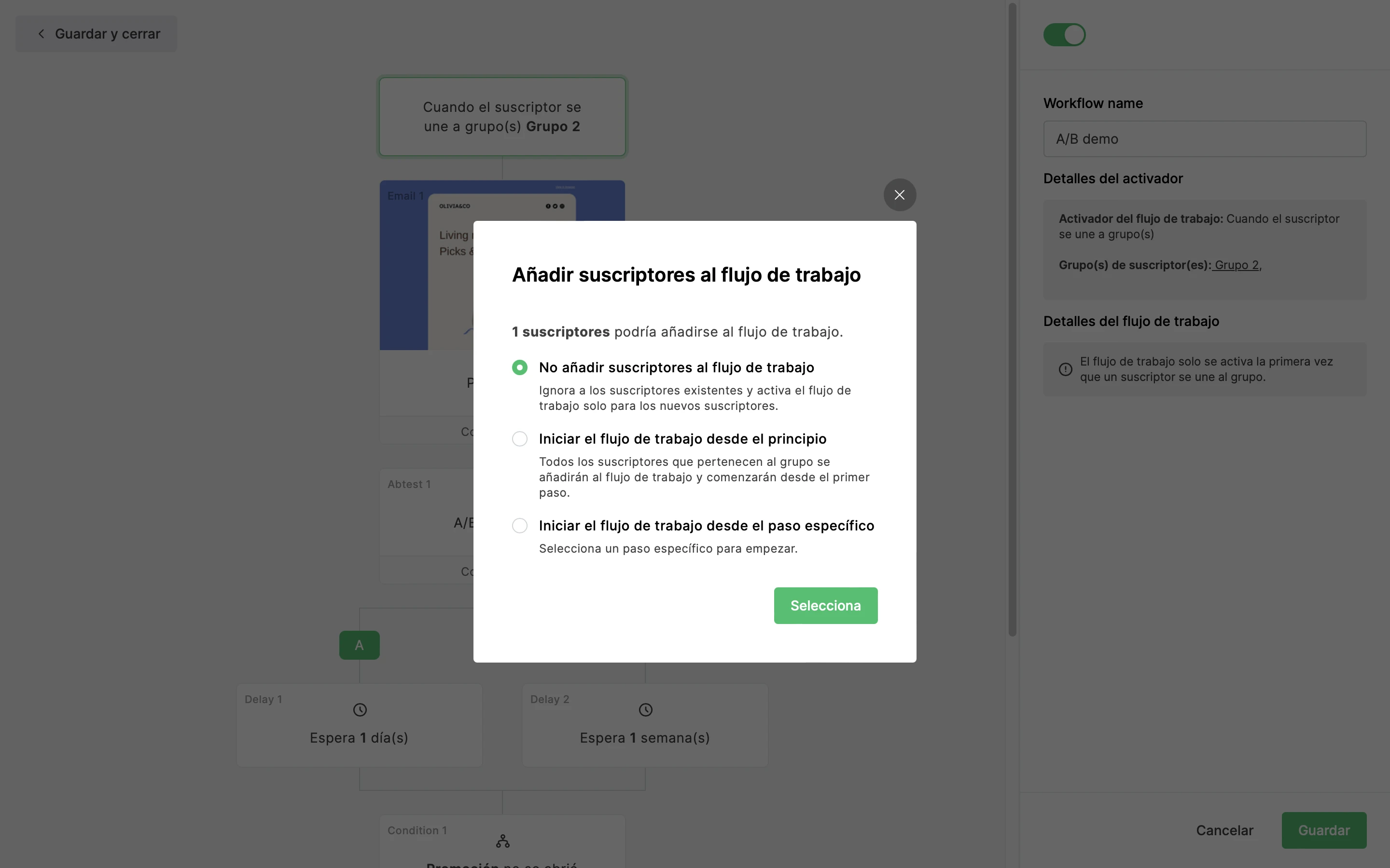 Al activar un flujo de trabajo, puede aparecer un pop-up para Agregar suscriptores existentes. Esto solo aplica a los suscriptores que ya existen, que aún no han ingresado al flujo y que cumplen con la condición del activador.