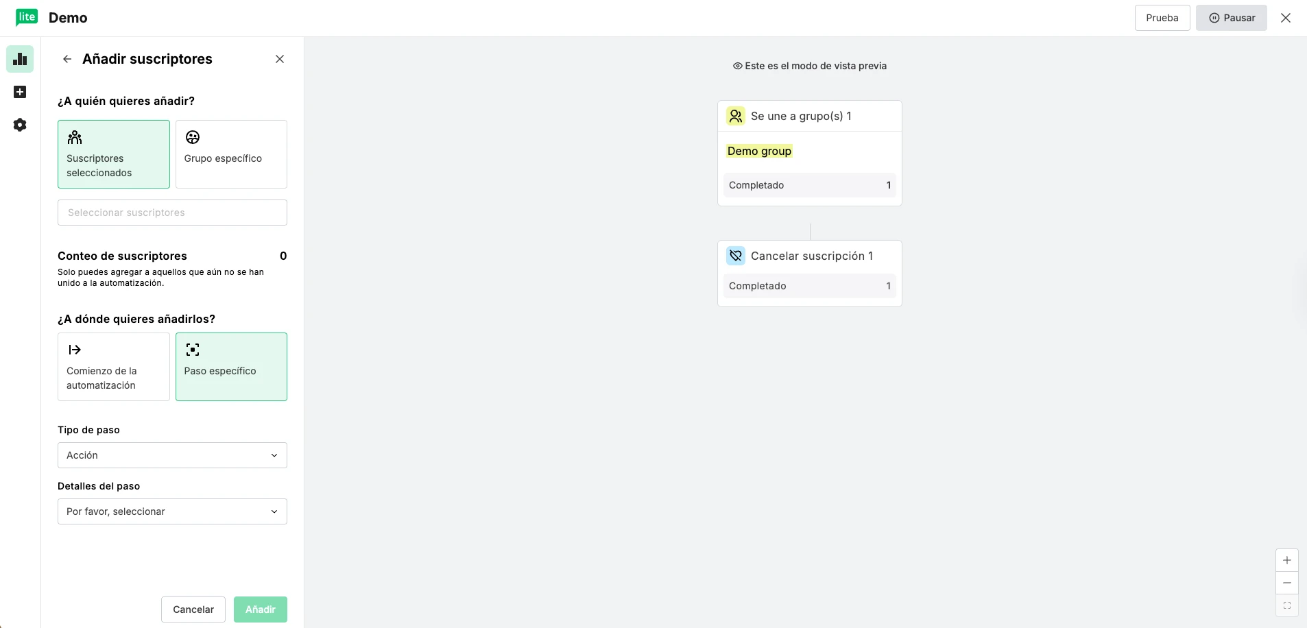 Sí, agregarlos a un paso específico: Agrega los suscriptores anteriores a cualquier paso de la automatización. Aquí puedes especificar a qué paso agregarlos.