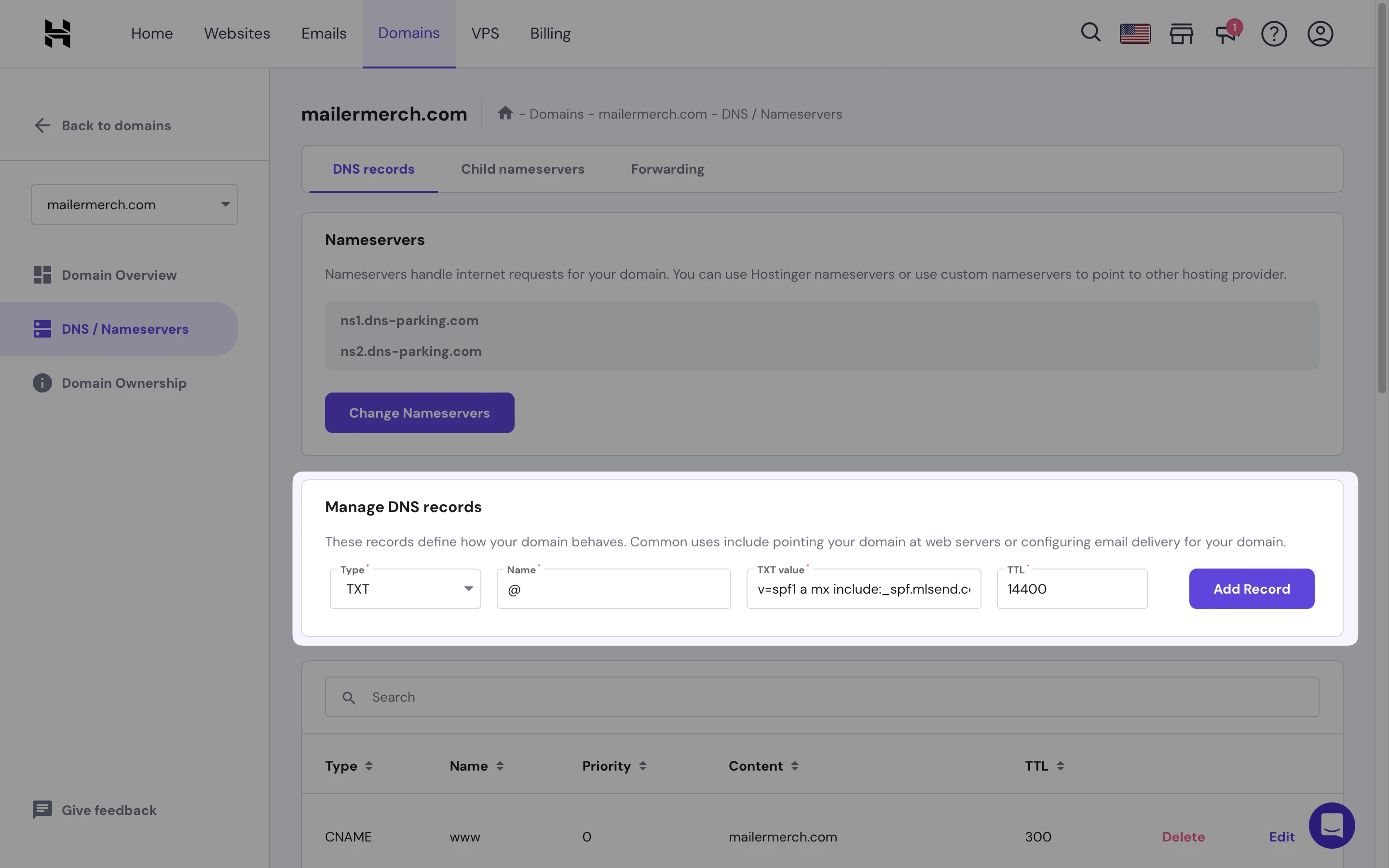 En el campo Valor TXT, introduce el Valor SPF que te han proporcionado en tu cuenta de MailerLite.