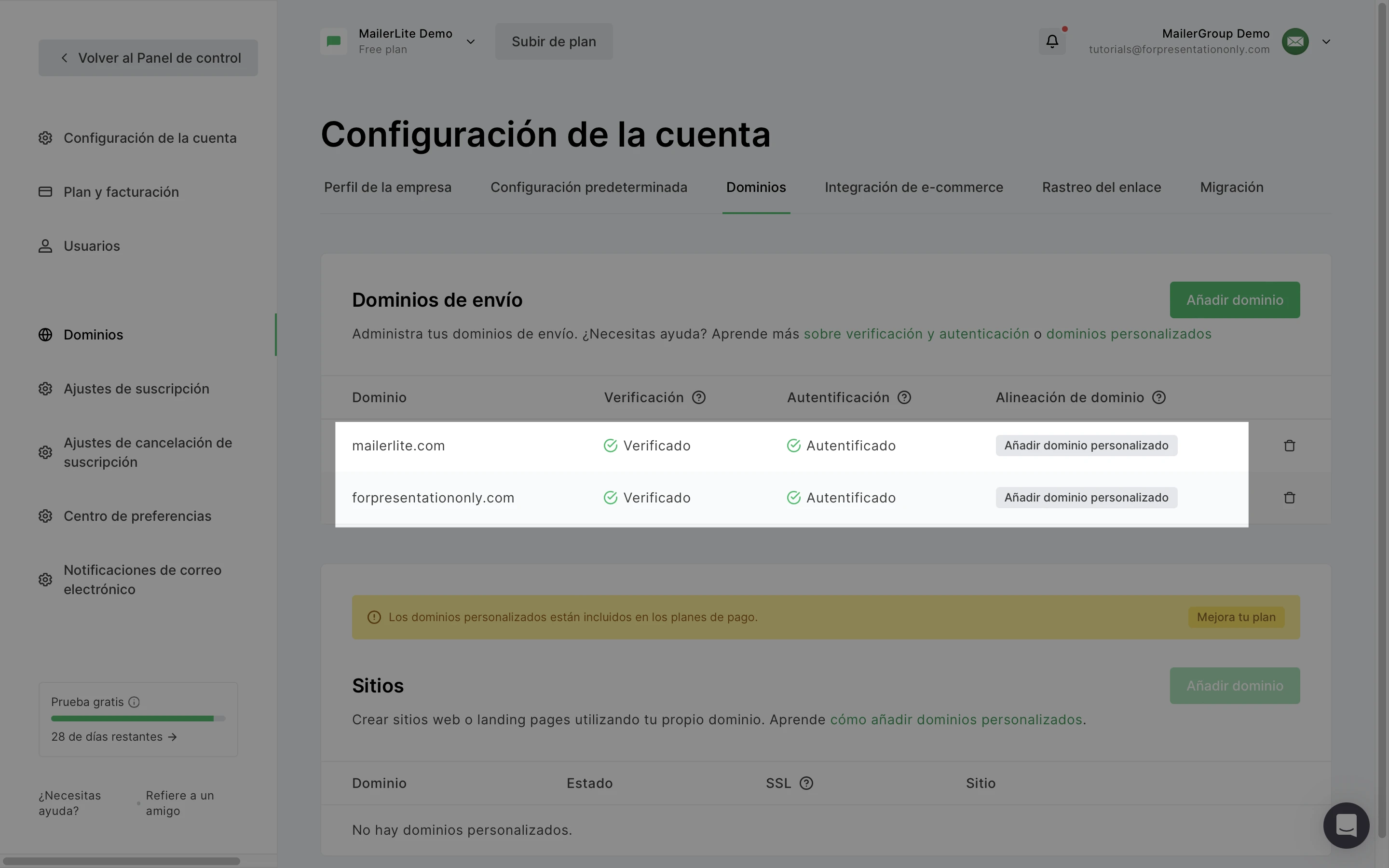 El dominio puede aparecer como autenticado de inmediato, o puede tardar hasta 24 horas. En este caso, verás Pendiente junto a tu dominio.