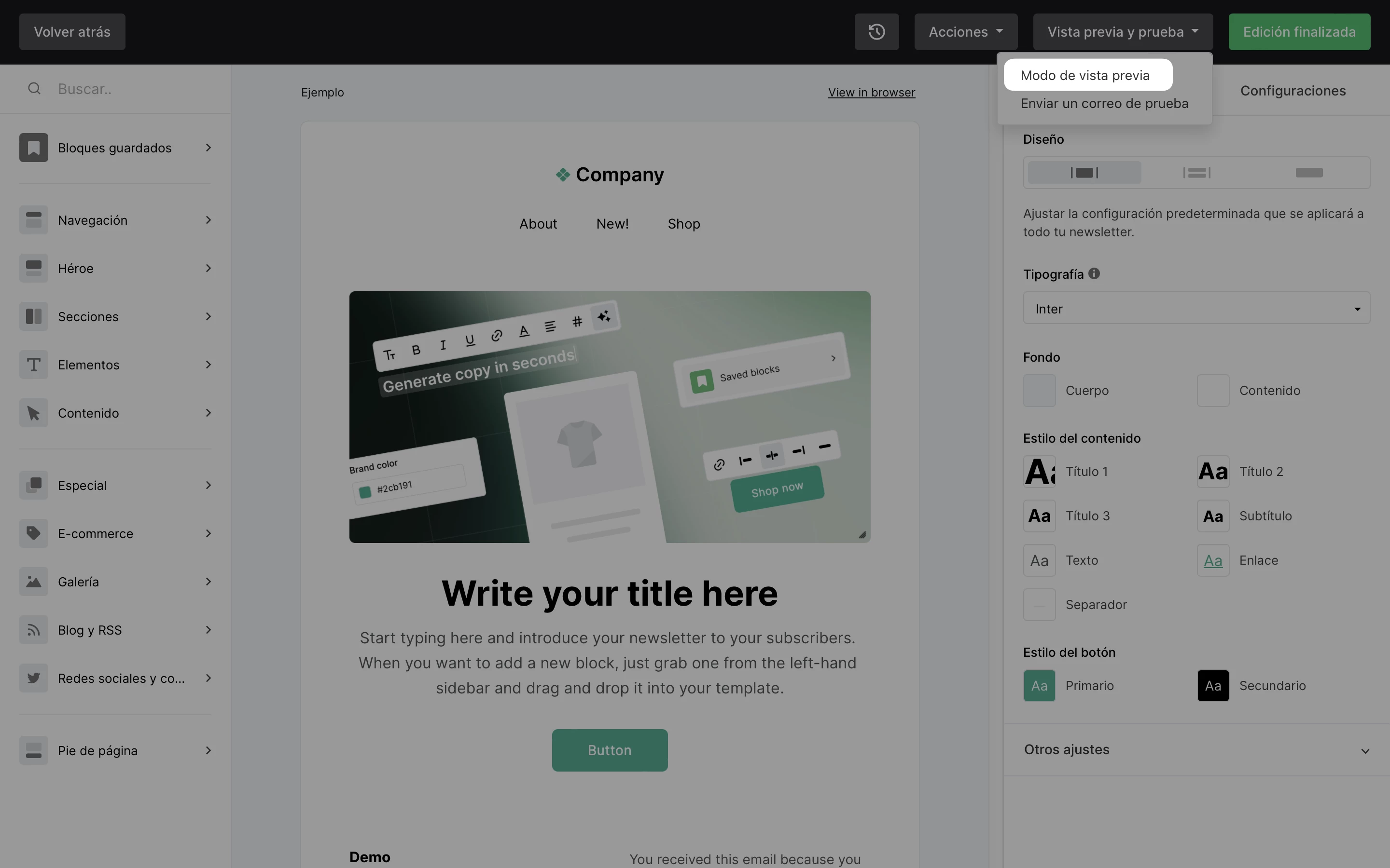 Para comprobar cómo se mostrará tu newsletter en dispositivos móviles, haz clic en el botón Previsualizar y probar situado en la cabecera superior del editor drag & drop y, a continuación, haz clic en Modo de previsualización.