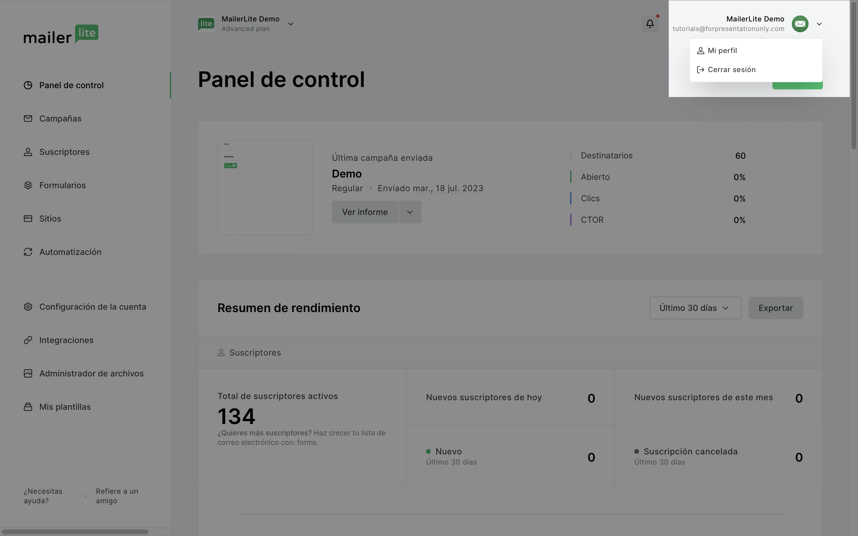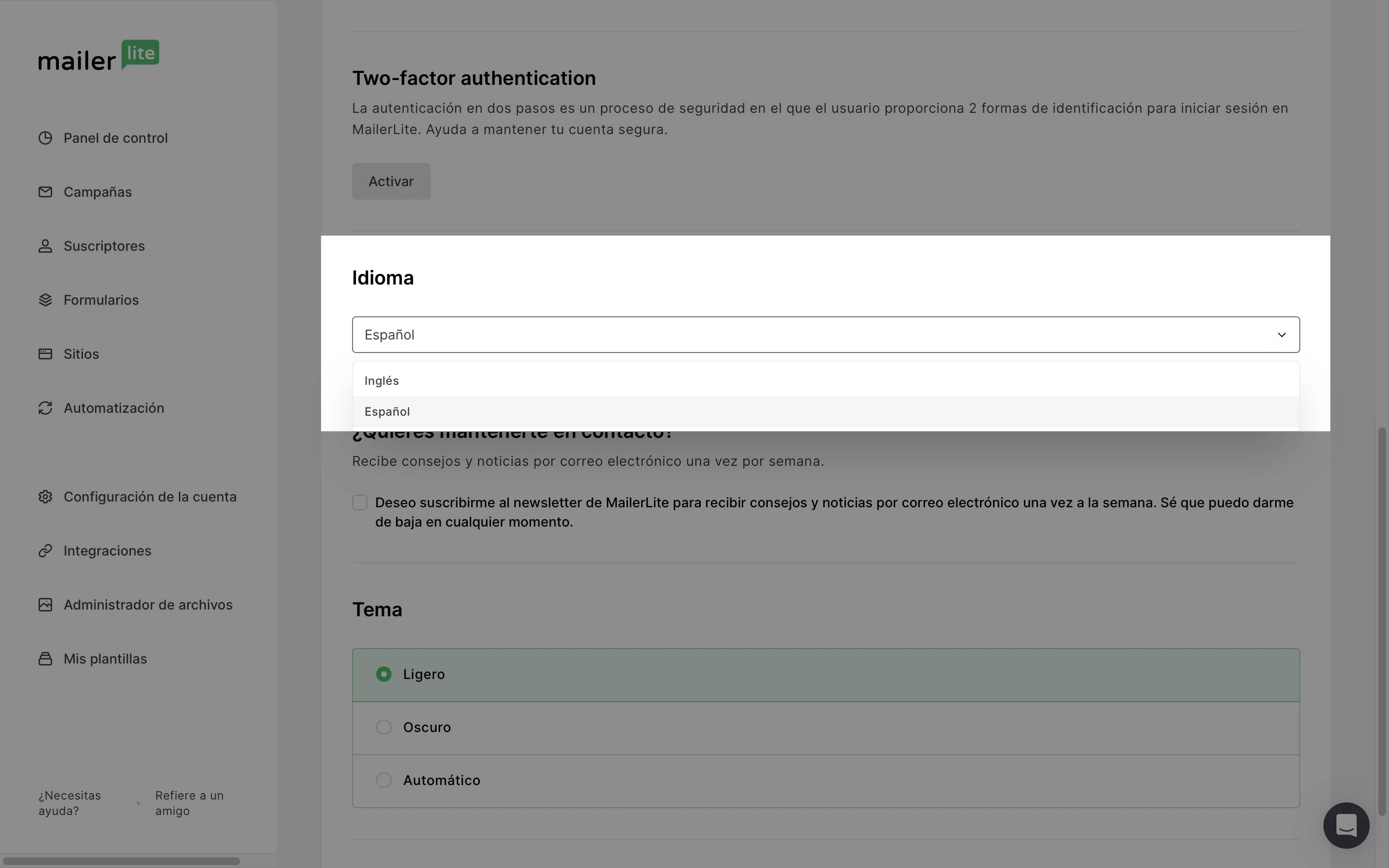 Ya está. La nueva configuración de idioma se aplicará a tu cuenta de MailerLite. La configuración de idioma se puede volver a cambiar a Inglés en cualquier momento desde Mi Perfil.