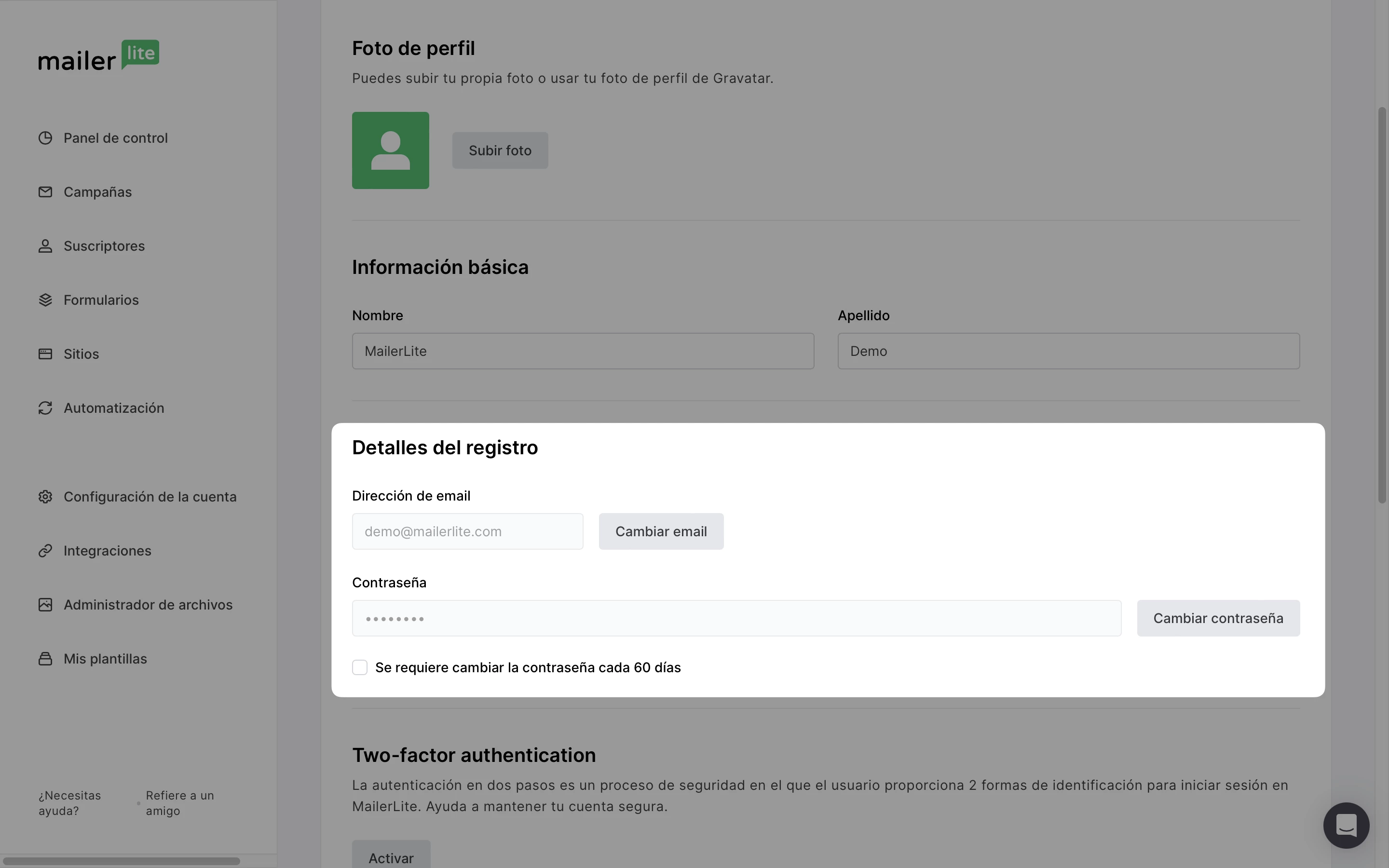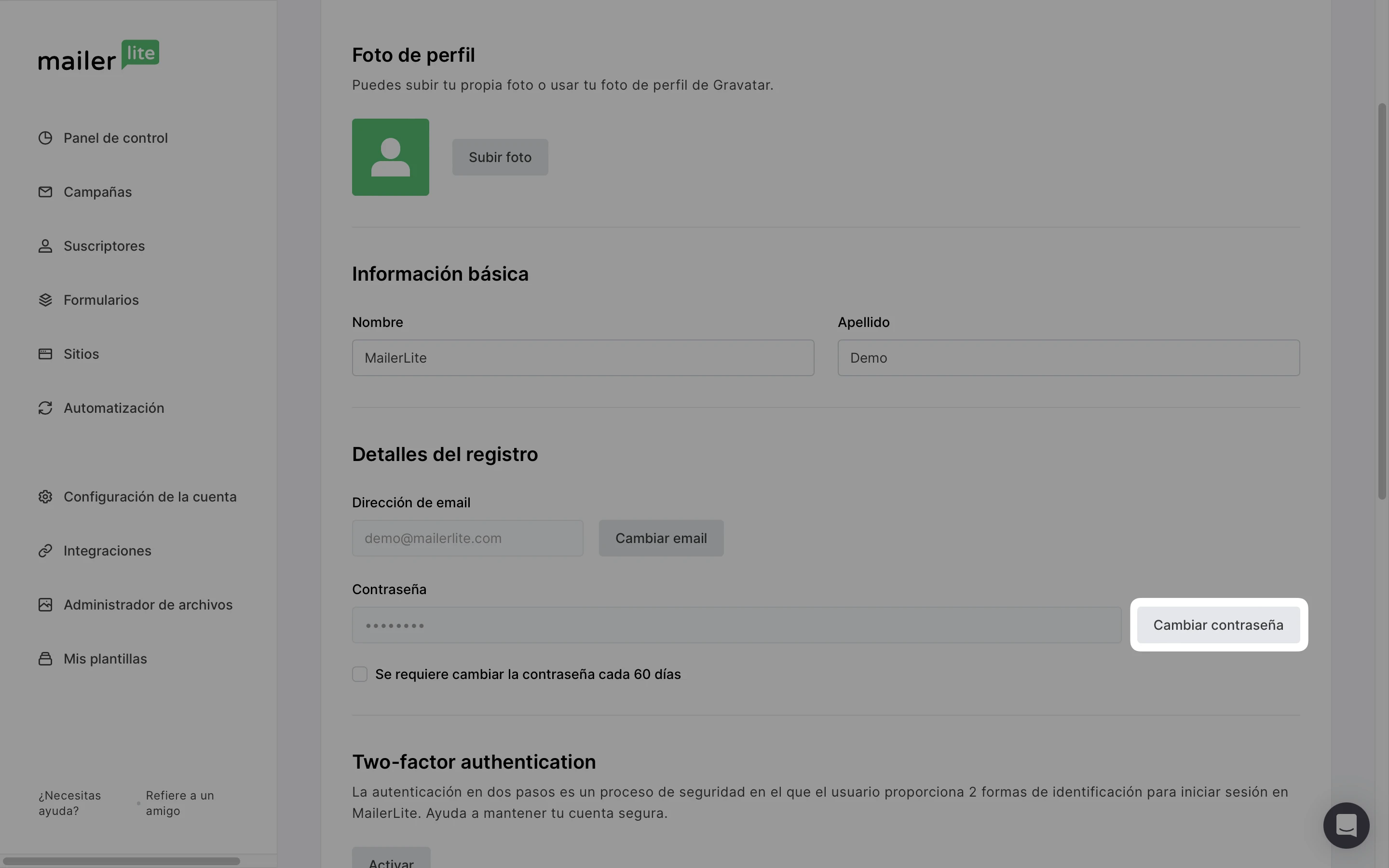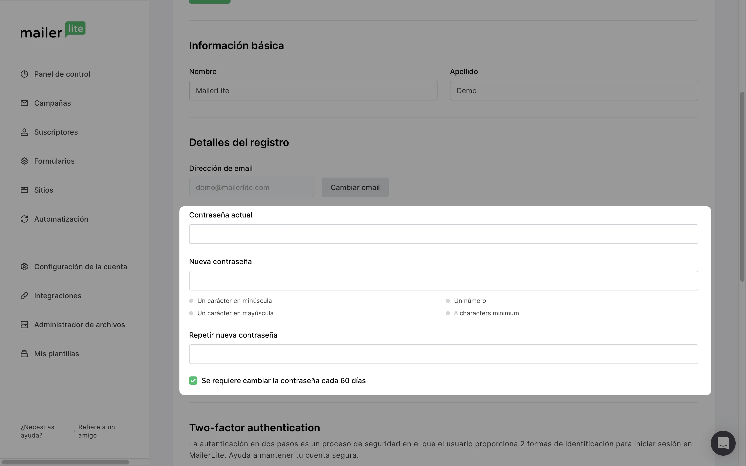 Nota: Recomendamos cambiar la contraseña cada 60 días para maximizar la seguridad de la cuenta.