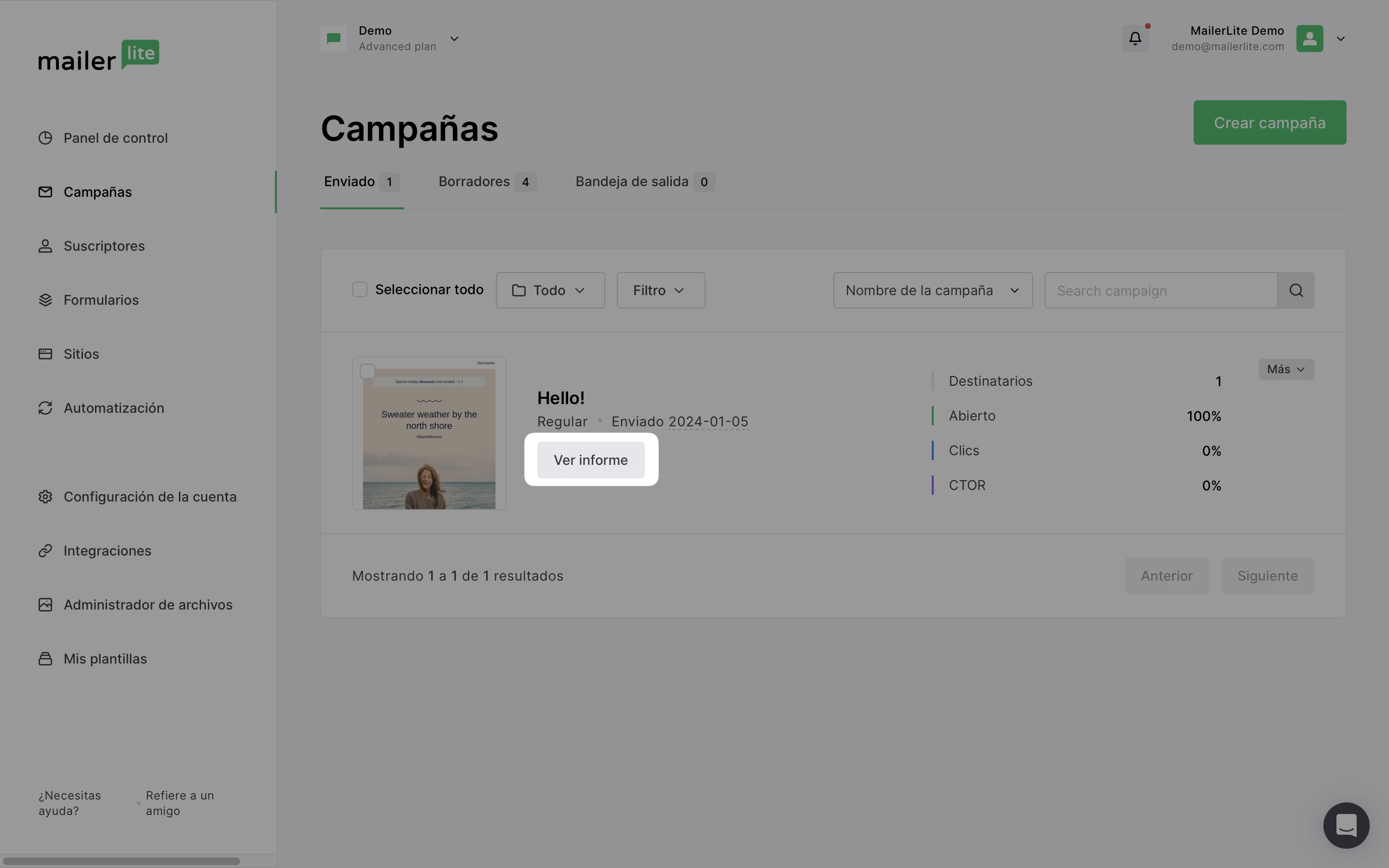 Haz clic en el botón Ver informe de la campaña que deseas examinar.