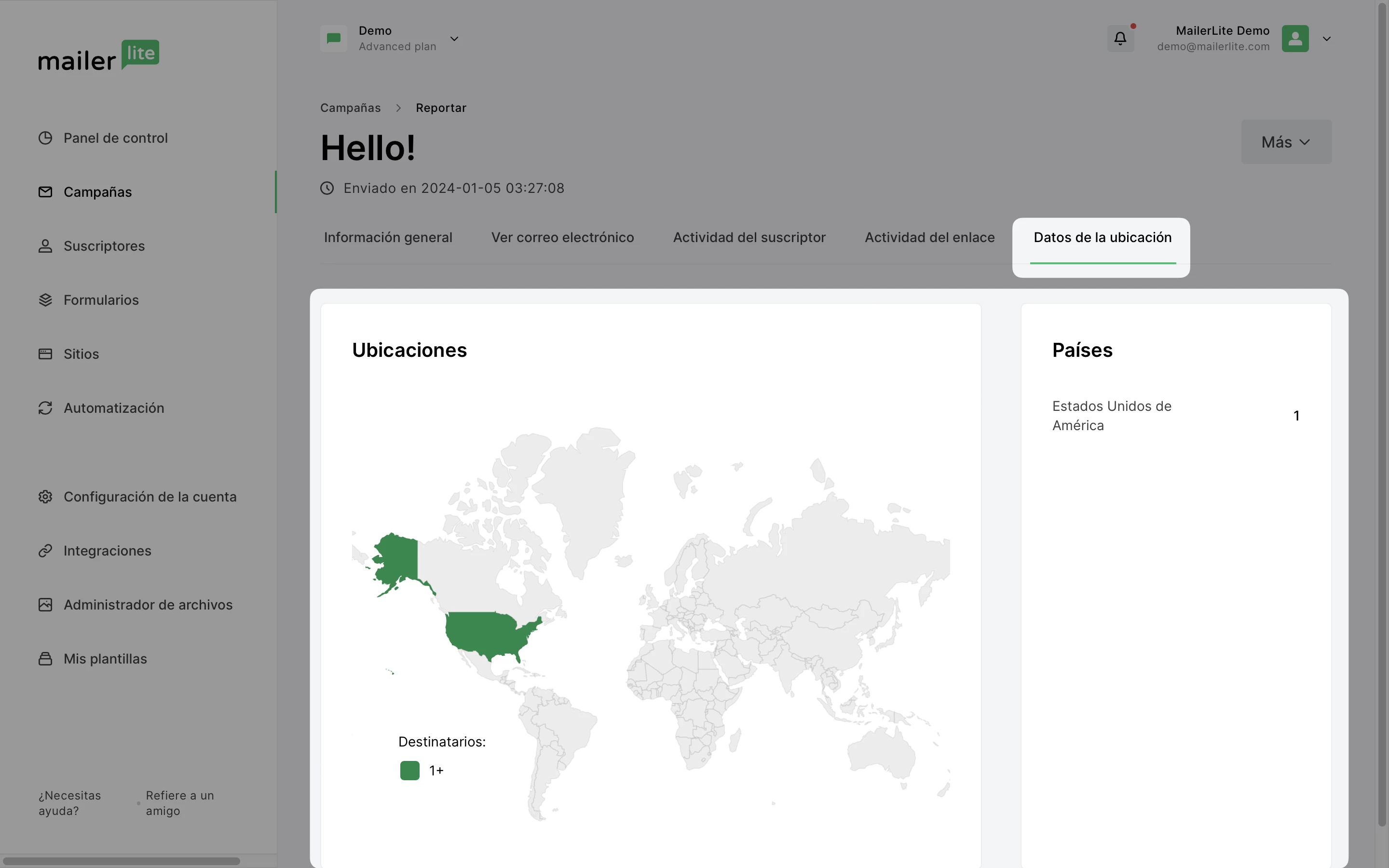 Los datos de localización se pueden encontrar en la página Informe de una campaña, donde se muestra un mapa de los países en los que se abrió tu campaña y cuántas aperturas tuvo en determinados países.