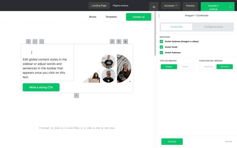 Puedes volver a publicar tu página de destino haciendo clic en el botón Guardar y publicar del editor de landing page.