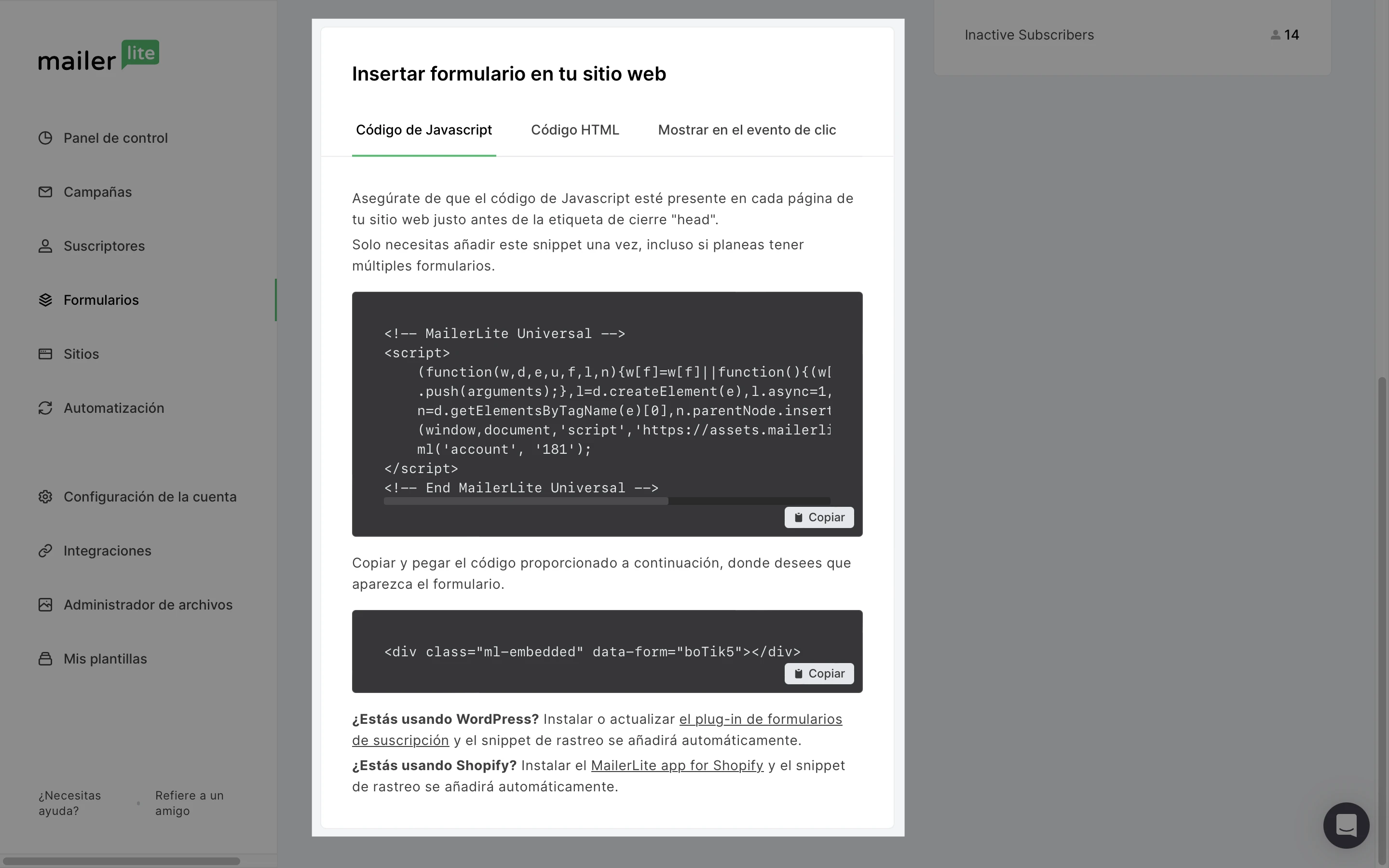 ¿Usas Wordpress o Shopify? Instala el plugin de MailerLite para Wordpress o el plugin de MailerLite para Shopify para instalar tus formularios en tu sitio web sin usar ningún código.