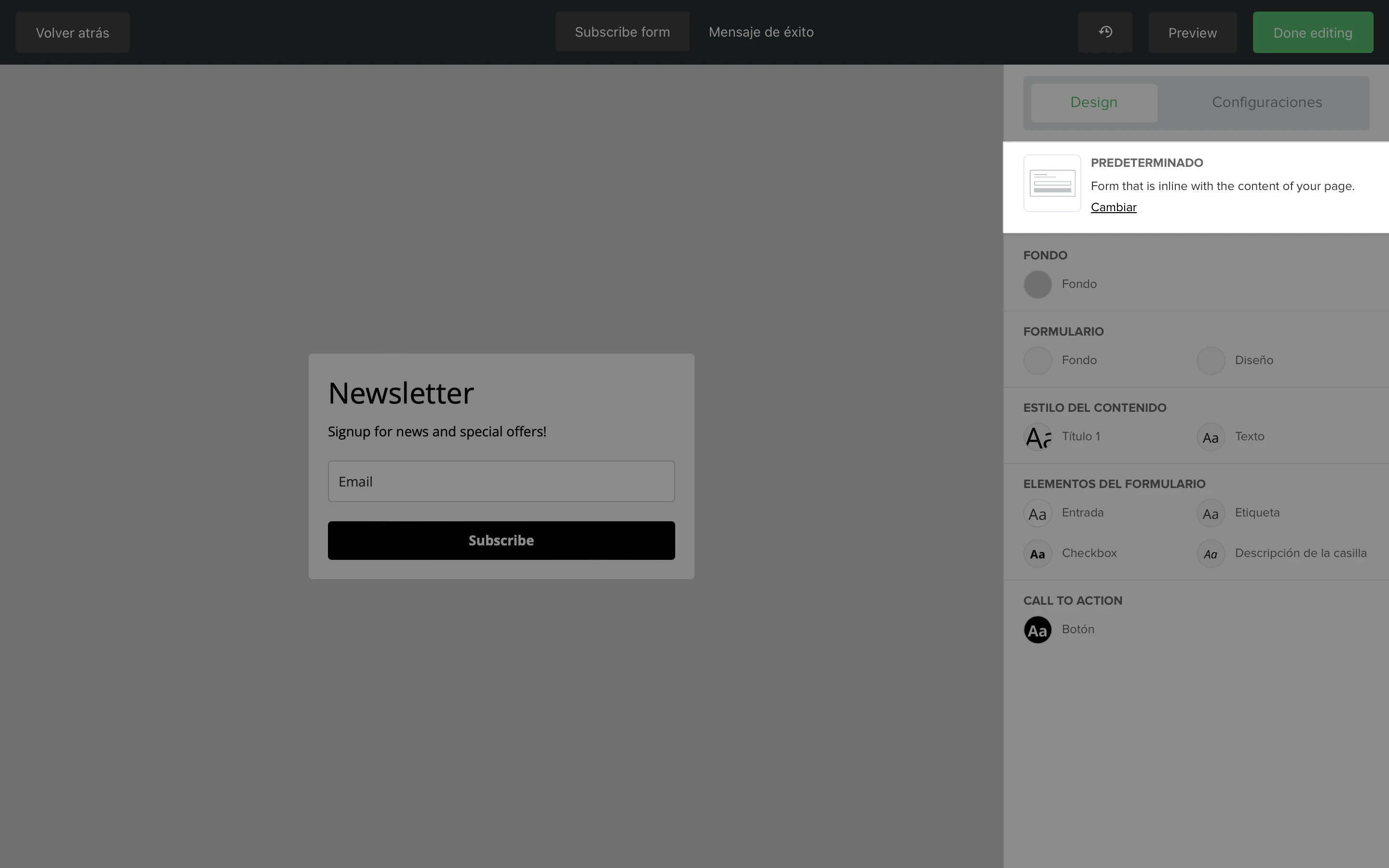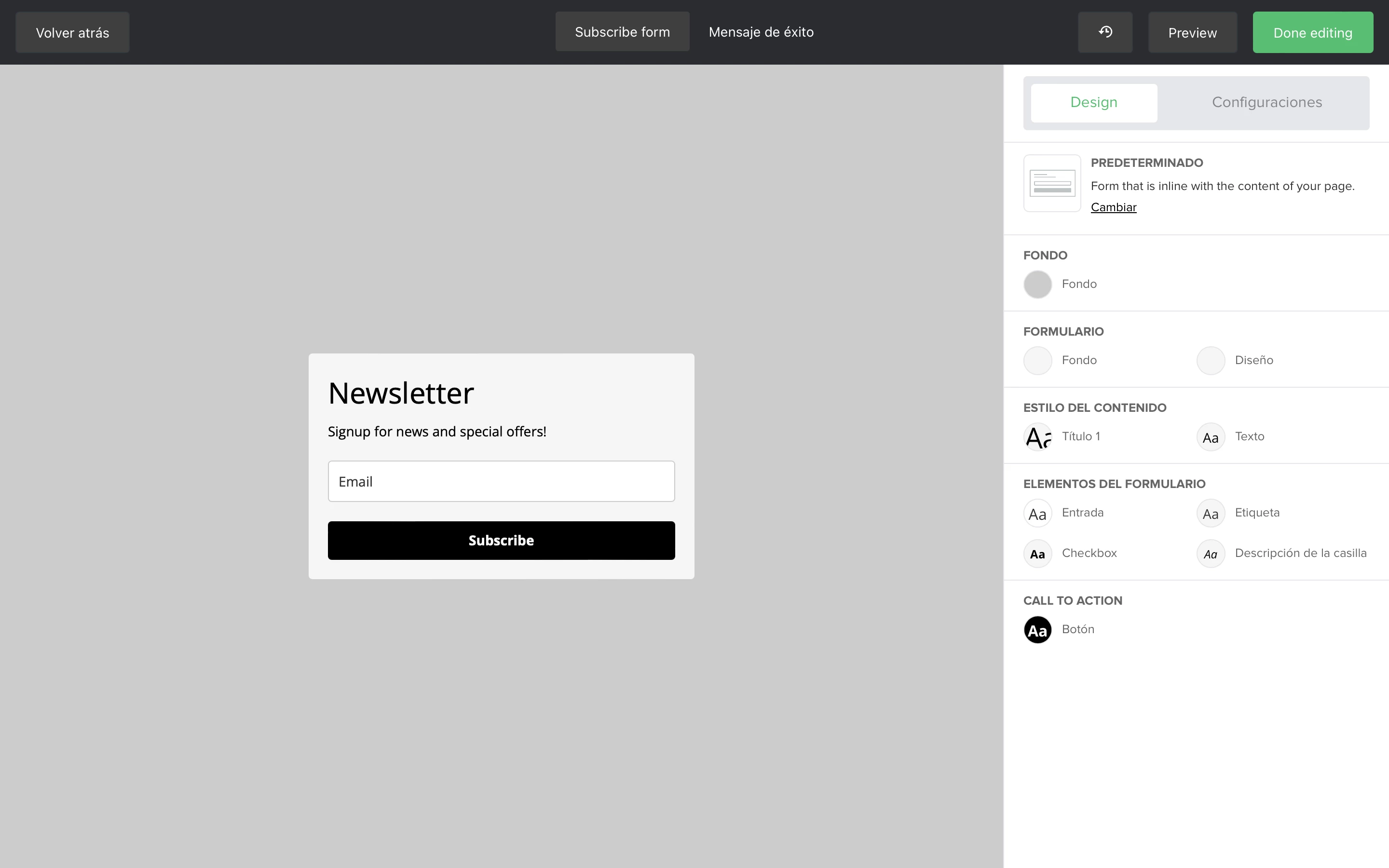 La pestaña de Diseño te permite editar el diseño visual de tu formulario. Encontrarás seis secciones dentro de la pestaña Diseño: Predeterminado, Fondo, Formulario, Estilo de contenido, Elementos de formulario y Llamado a la acción.