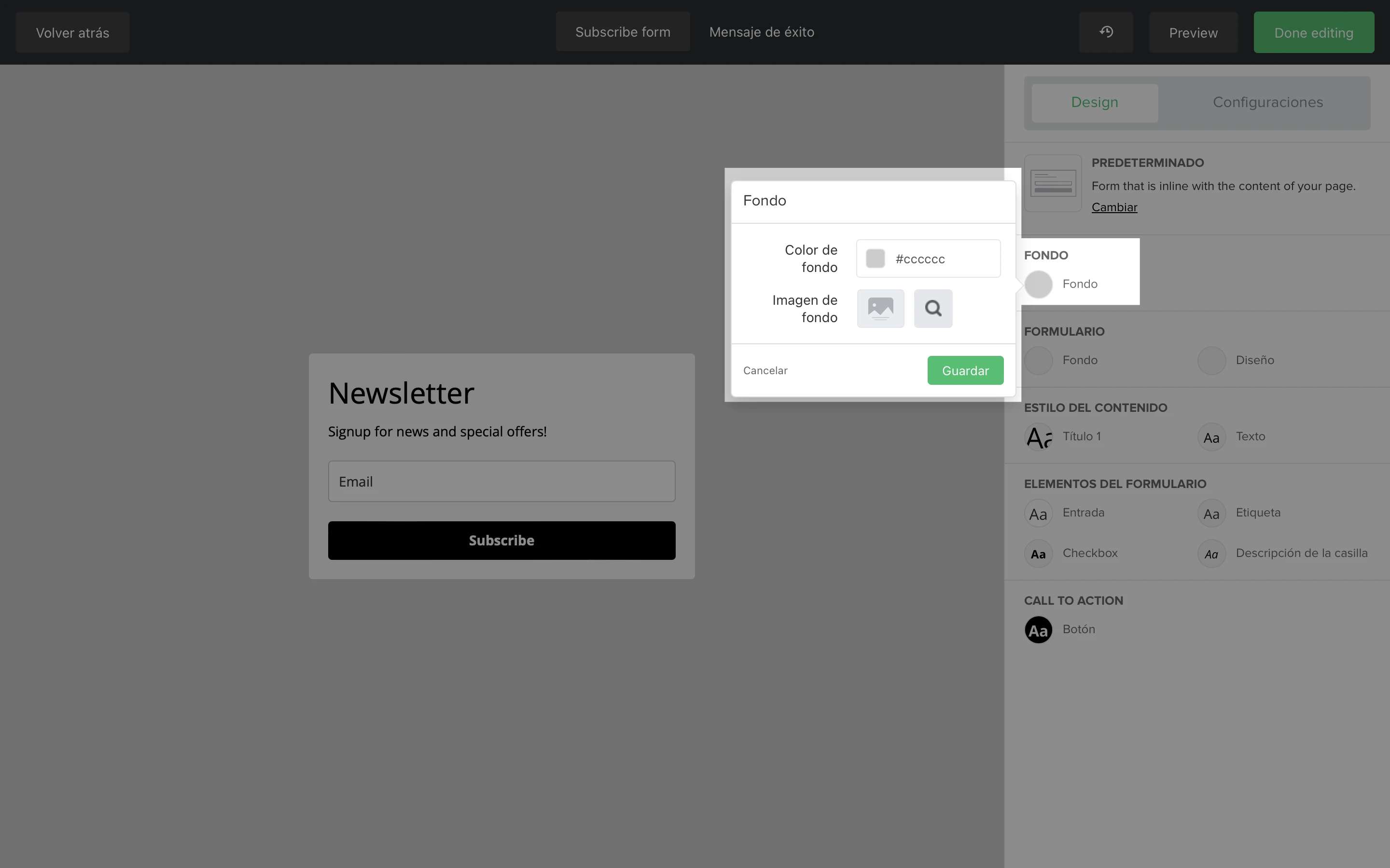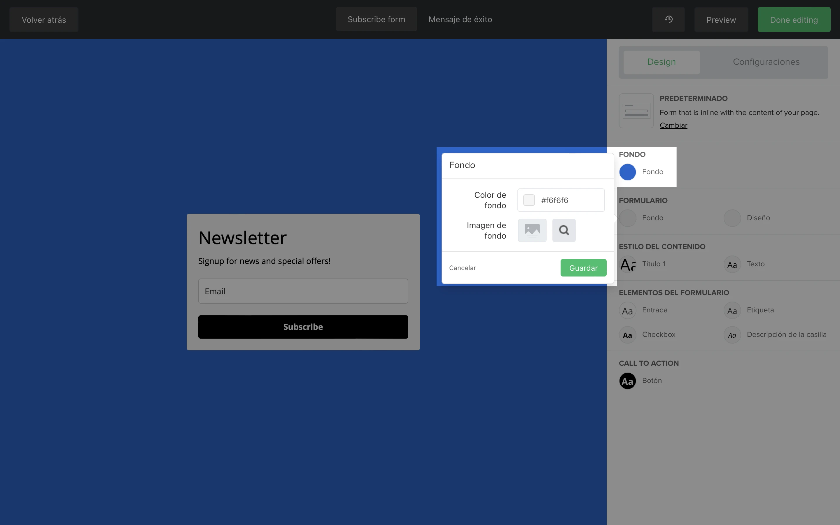 En la sección de Formulario, puedes editar el diseño del formulario en su totalidad. Hay dos burbujas de diseño denominadas Fondo y Diseño.