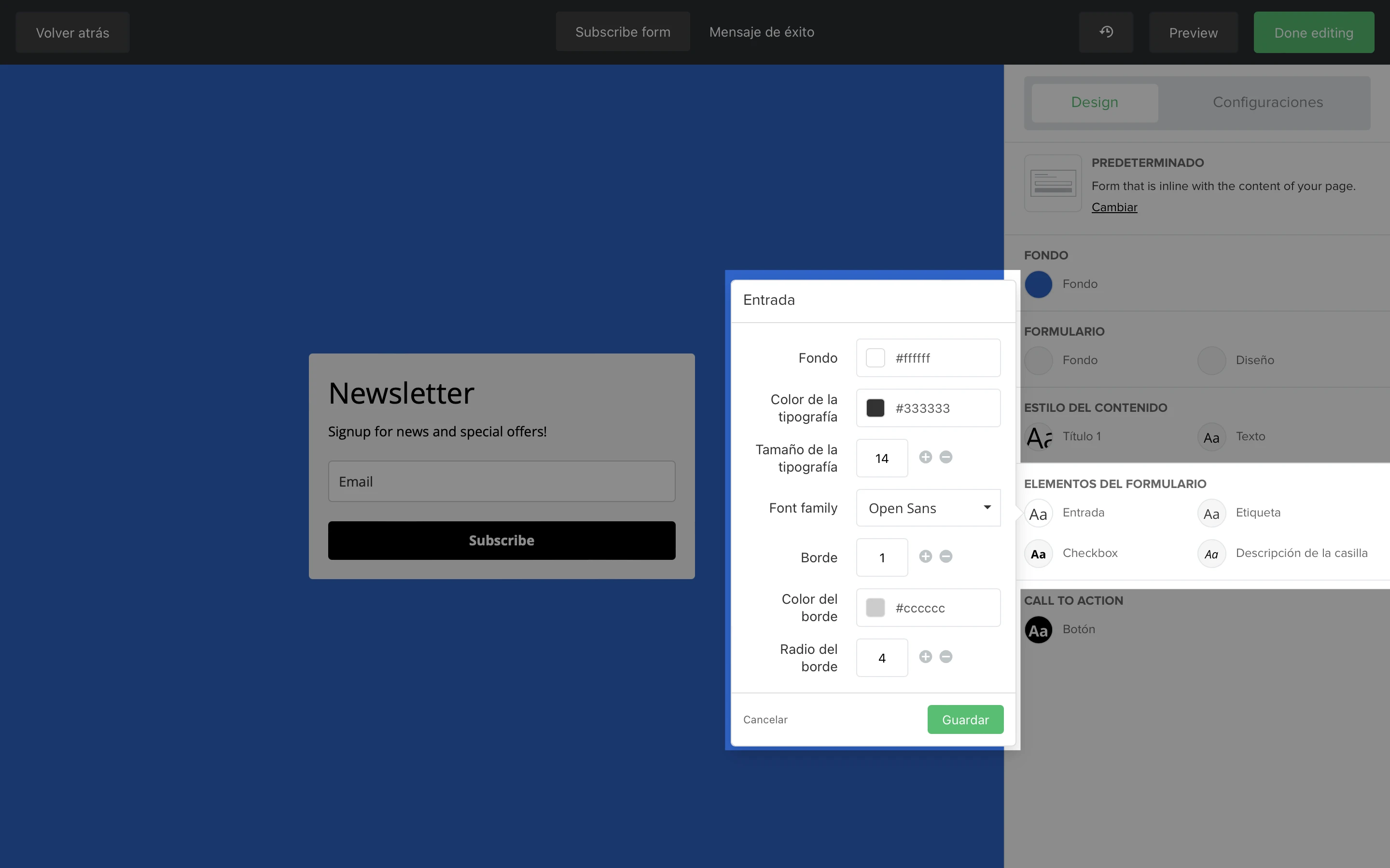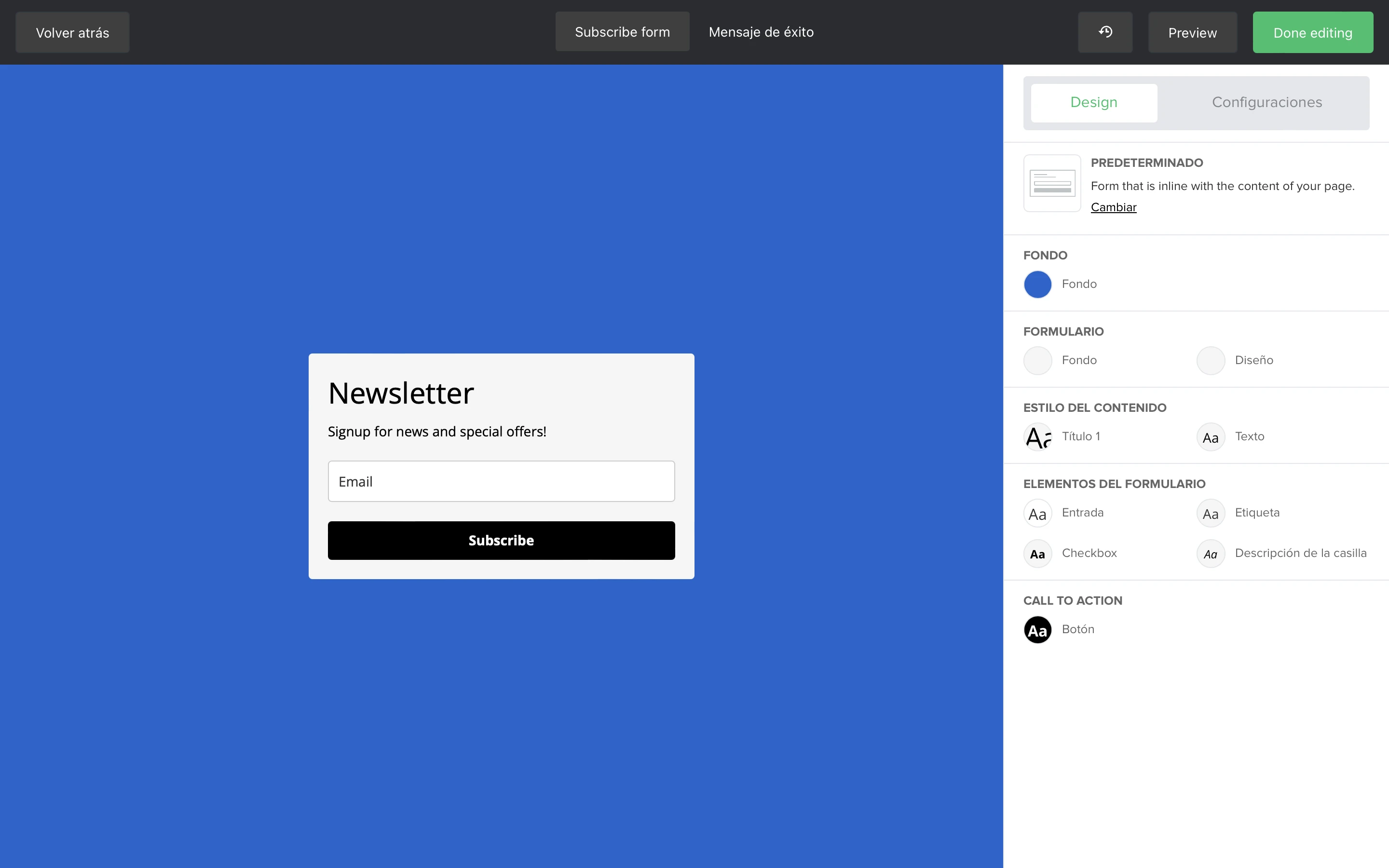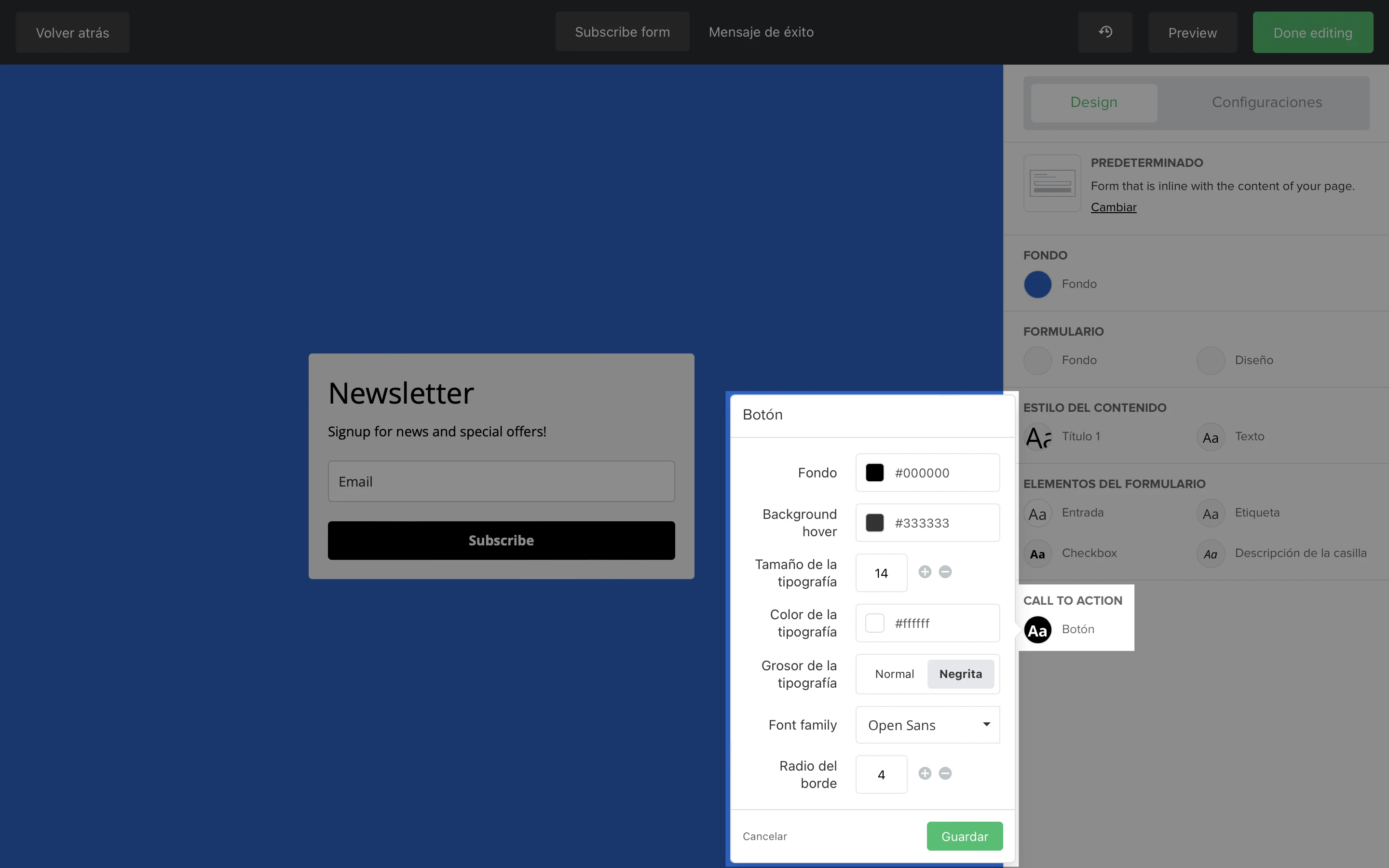 La sección de Llamada a la acción te permite editar el diseño y el formato del botón en tu formulario. Puedes editar el fondo (color) del botón, el color de fondo, el tamaño, el color, el grosor y la familia de la tipografía, y el radio del borde.