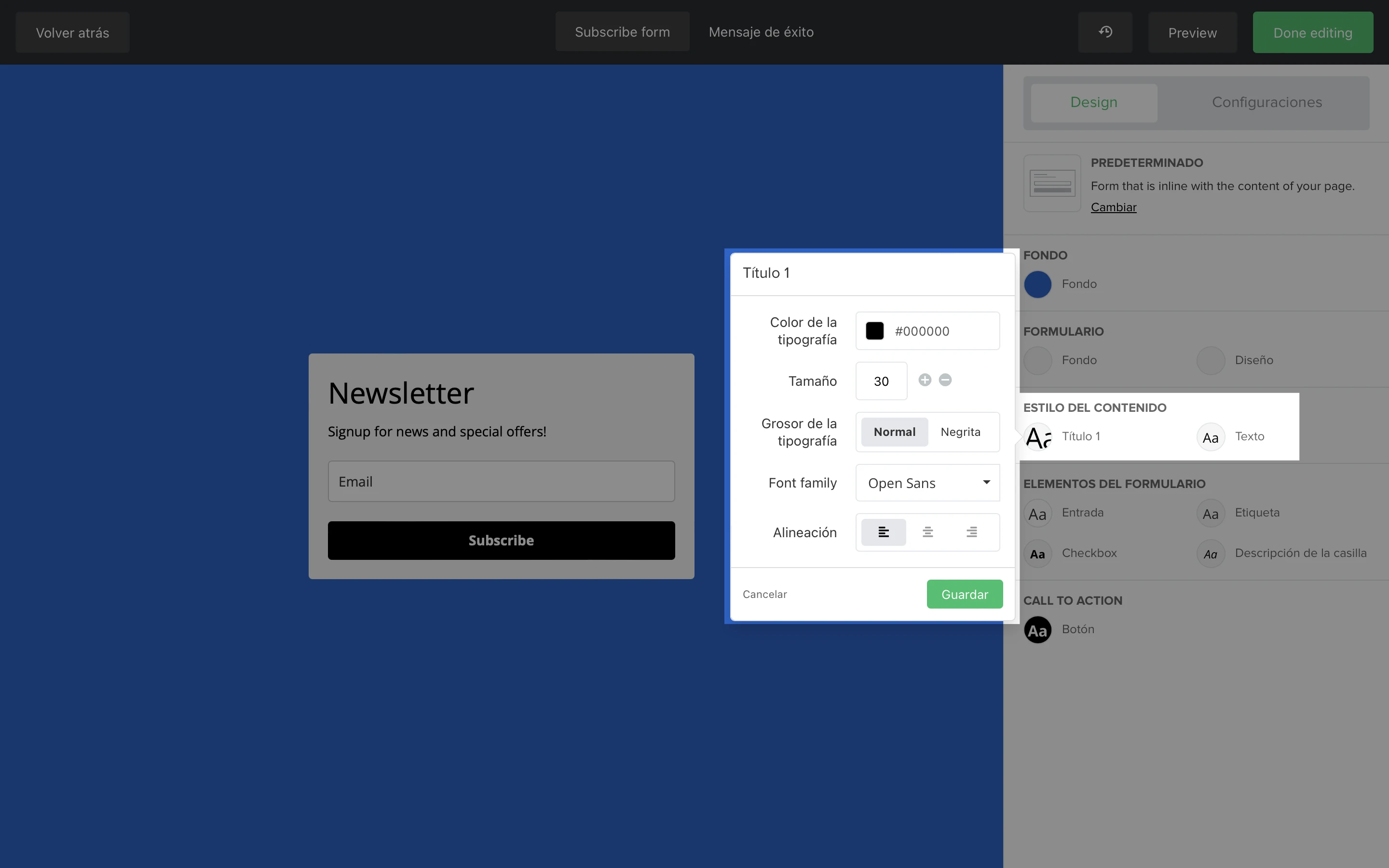 La sección Estilo del contenido te permite editar el estilo del texto dentro del formulario. Puedes editar la familia, el color y el tamaño de la tipografía y la alineación de tanto del encabezado como del texto.